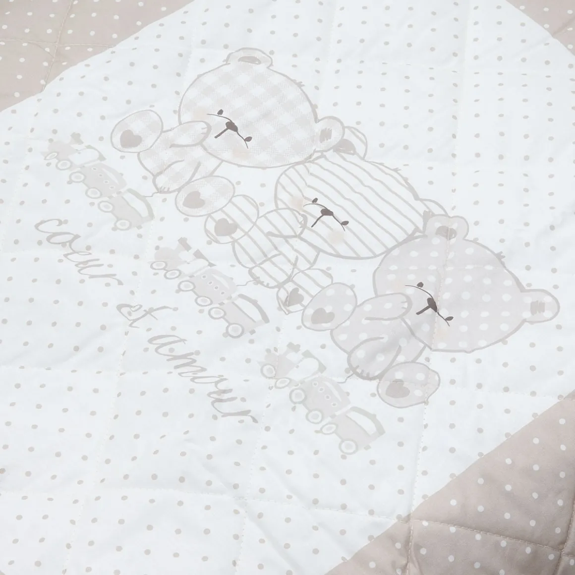 Set 3 pezzi lettino unisex composto da federa lenzuolo con angoli e lenzuolo sopra. Banda lenzuolo con stampa piazzata orsetti e fantasia pois beige. Stampa piazzata orsetto su federa. Lenzuolo con angoli tinta unita bianco. Coordinabile con set 4 pezzi della stessa serie. Dimensioni: Lenzuolo sotto 120*180 cm Lenzuolo sopra 60*135*20 cm Federa 35*60 cm.