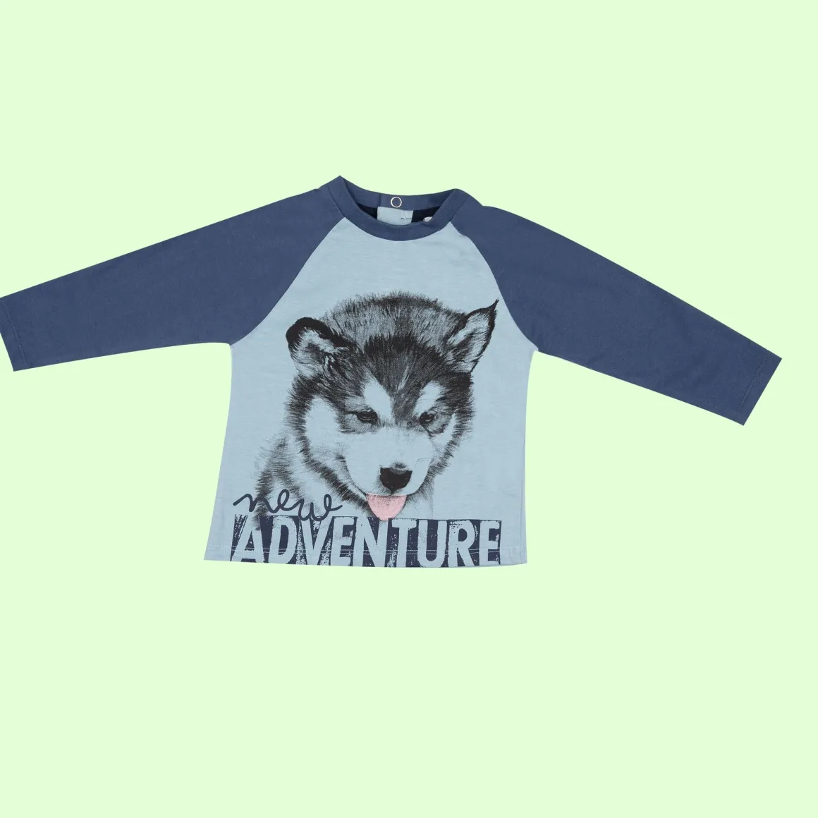 T-shirt bicolore manica lunga raglan in morbido cotone mano calda interna, in panna e grigio melange, con stampa jeep. L’apertura sul retro con bottoni a pressione facilita il passaggio testa. Disponibile in diverse varianti colore.