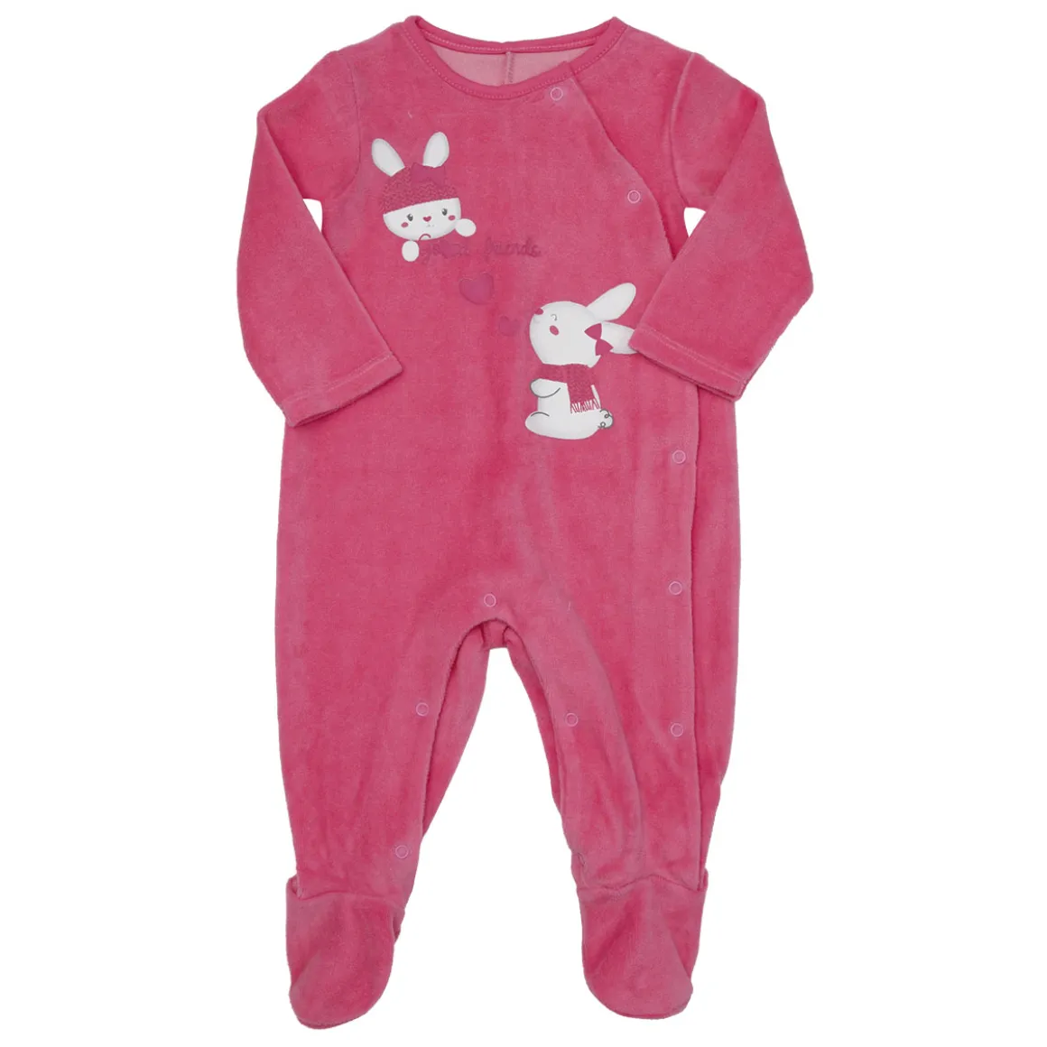 Romantica tutina in calda ciniglia in un brillante fuxia . Motivo stampa conigliette e cuoricini . Oltre all’ apertura sul fronte, presenta una comoda apertura entrogamba per facilitare il cambio del pannolino. Vestibilità comoda. Modello certificato oeko-tex.