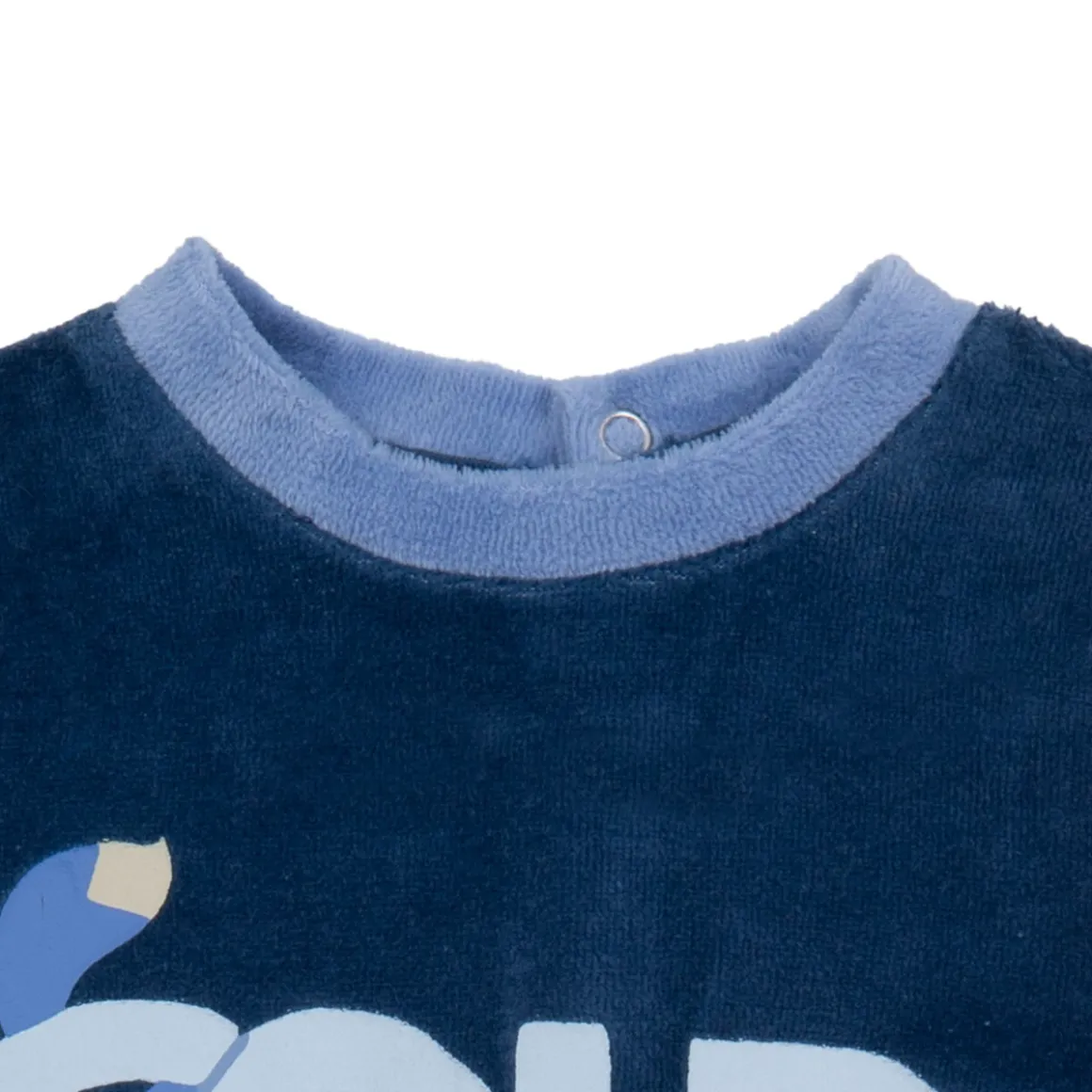 Deliziosa tutina in ciniglia a girocollo blu con dettagli beige. Il capo è impreziosito da divertente scritta con animaletti. Oltre all’apertura frontale la tutina presenta una comoda apertura entrogamba .Vestibiilità comoda. Modello certificato oeko-tex .