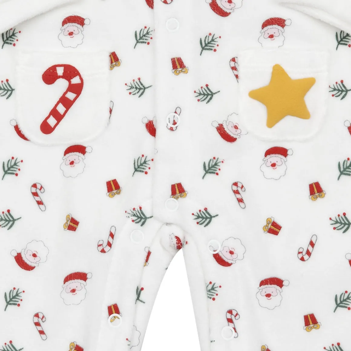 Divertente tutina ciniglia natale aperta davanti con motivo taschine. Deliziosa fantasia multicolor su un delicato fondo panna. Perfetta per l’outfit natalizio del tuo bebè e ottima come idea regalo. Oltre all’apertura frontale presenta una comoda apertura entrogamba per facilitare il cambio del pannolino.