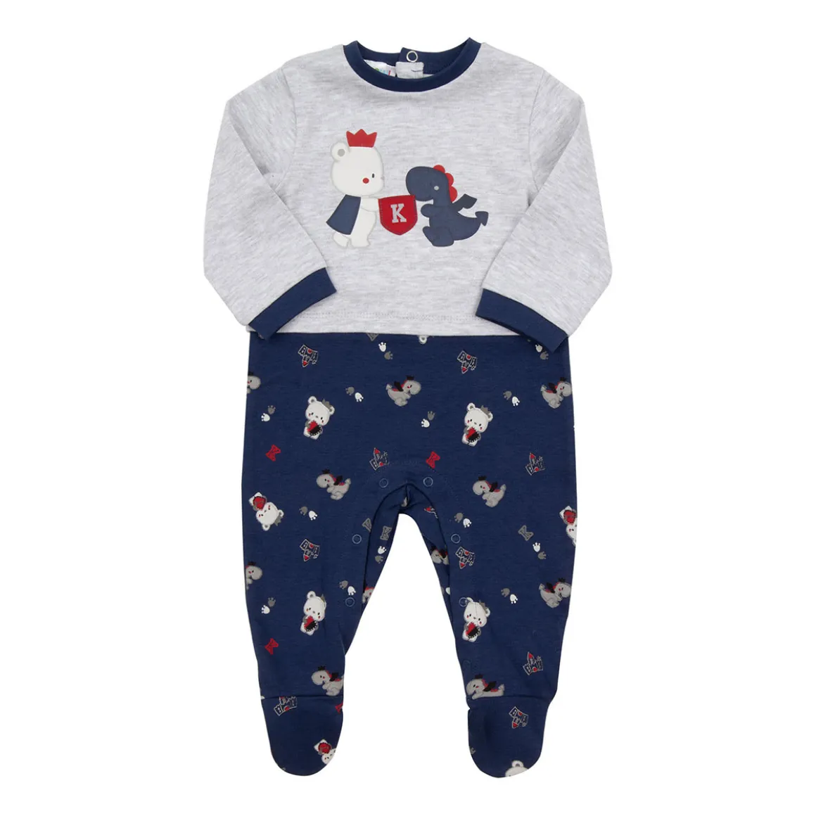 Deliziosa tutina in caldo cotone finta doppia con stampa orsetto e draghetto, spezzata da una fantasia multicolor sullla parte sotto a fondo blu . La tutina presenta una comoda apertura sul cavallo e sul retro . Vestibiilità comoda.