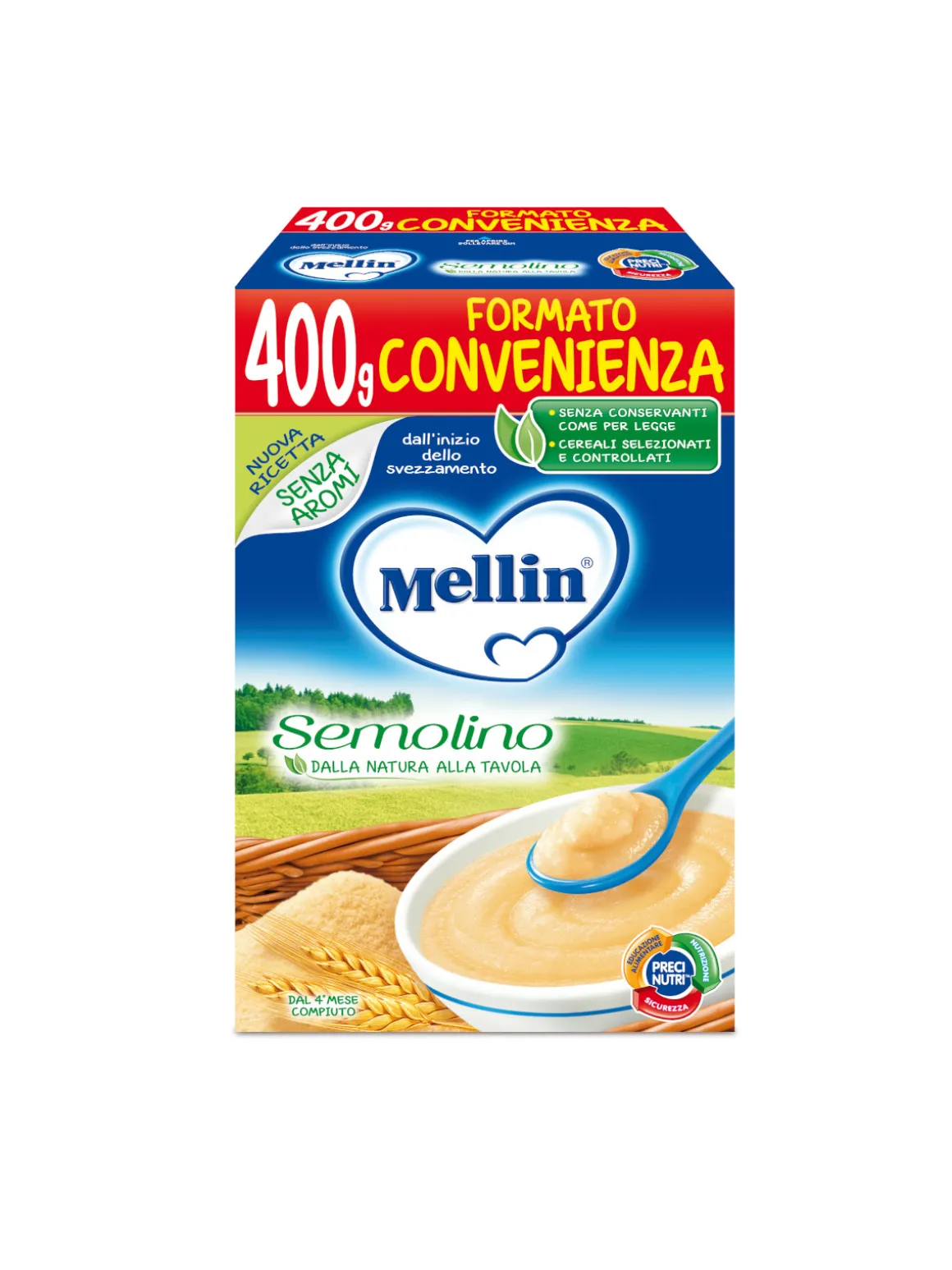 Il semolino Mellin è tra i primi alimenti che vengono introdotti nella dieta del bambino per iniziare ad abituarlo delicatamente ai primi cibi solidi, sentito il parere del Pediatra. Il semolino Mellin è senza aromi ed è composto da cereali idrolizzati e rigorosamente controllati.