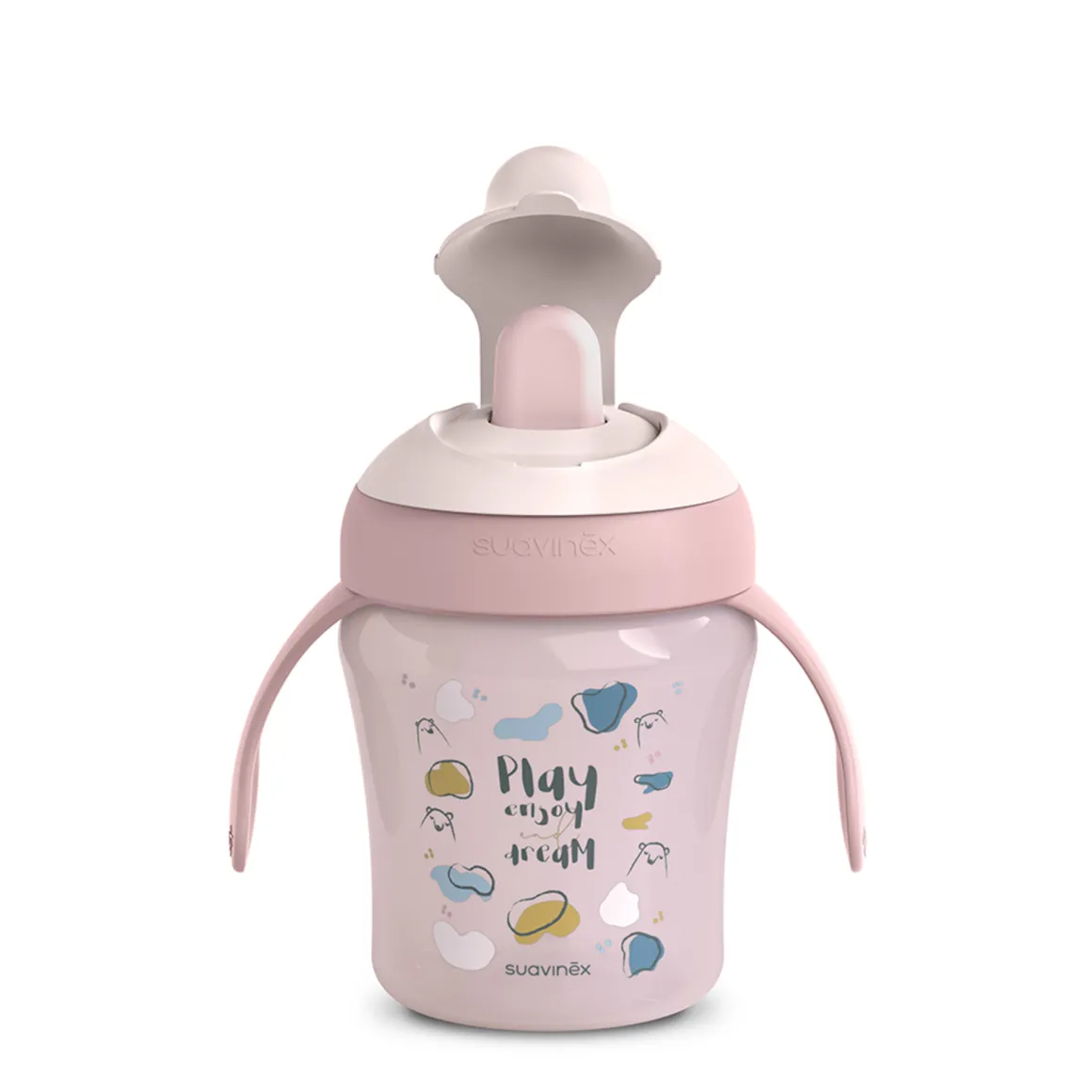 Tazza antigoccia da 200ml Suavinex della collezione My Family con manici e beccuccio rigido a prova di dentini, perfetta per il passaggio dal biberon alla tazza durante la fase di dentizione perché i dentini del bambino non graffiano il beccuccio.