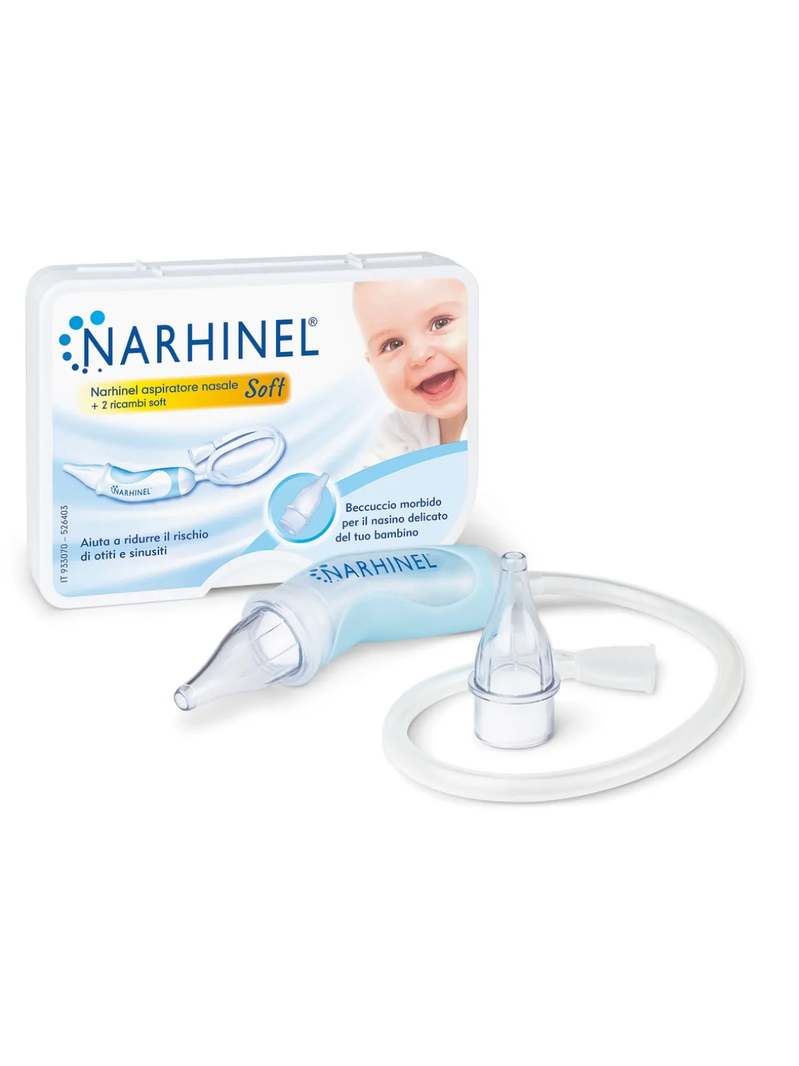 raffreddore comune.NARHINEL ASPIRATORE NASALE SOFT è delicato col nasino grazie al beccuccio morbido monouso, che si adatta al nasino del bambino. Nella confezione sono forniti due beccucci morbidi monouso. Ciascuno contiene un filtro
