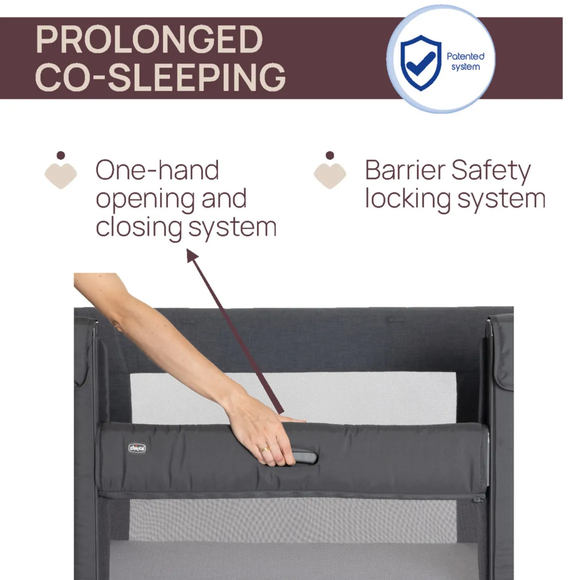 Sistema brevettato della barriera: meccanismo di sicurezza che impedisce di mantenere la barriera aperta se il prodotto non è agganciato correttamente al letto dei genitori.
