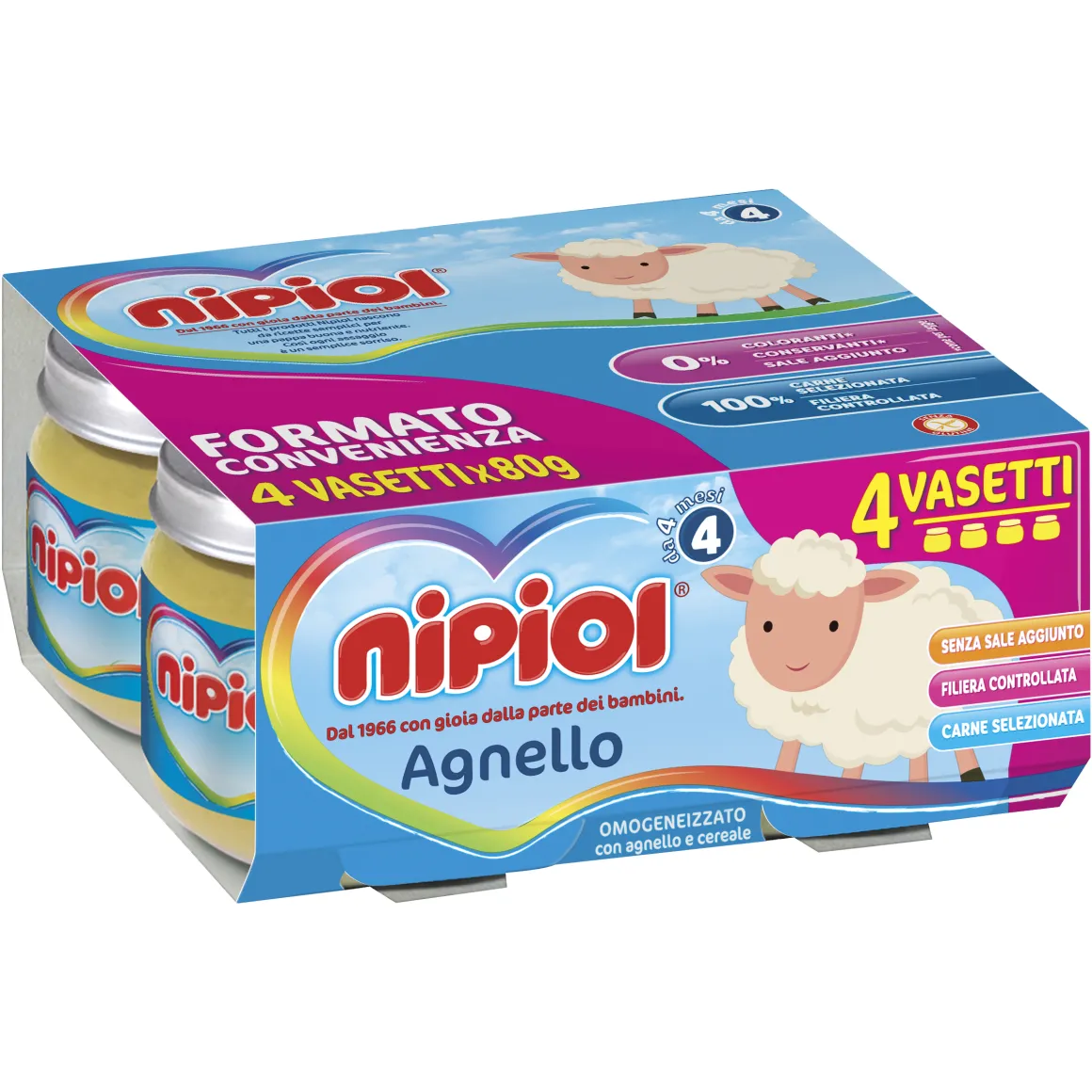 Alimento per l’infanzia Omogeneizzato con Agnello e Cereale.Prodotto indicato a partire dal 4° Mese compiuto, salvo diverso parere del Pediatra.