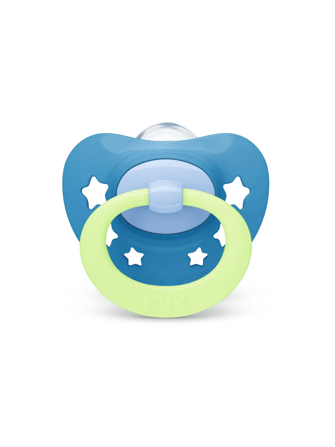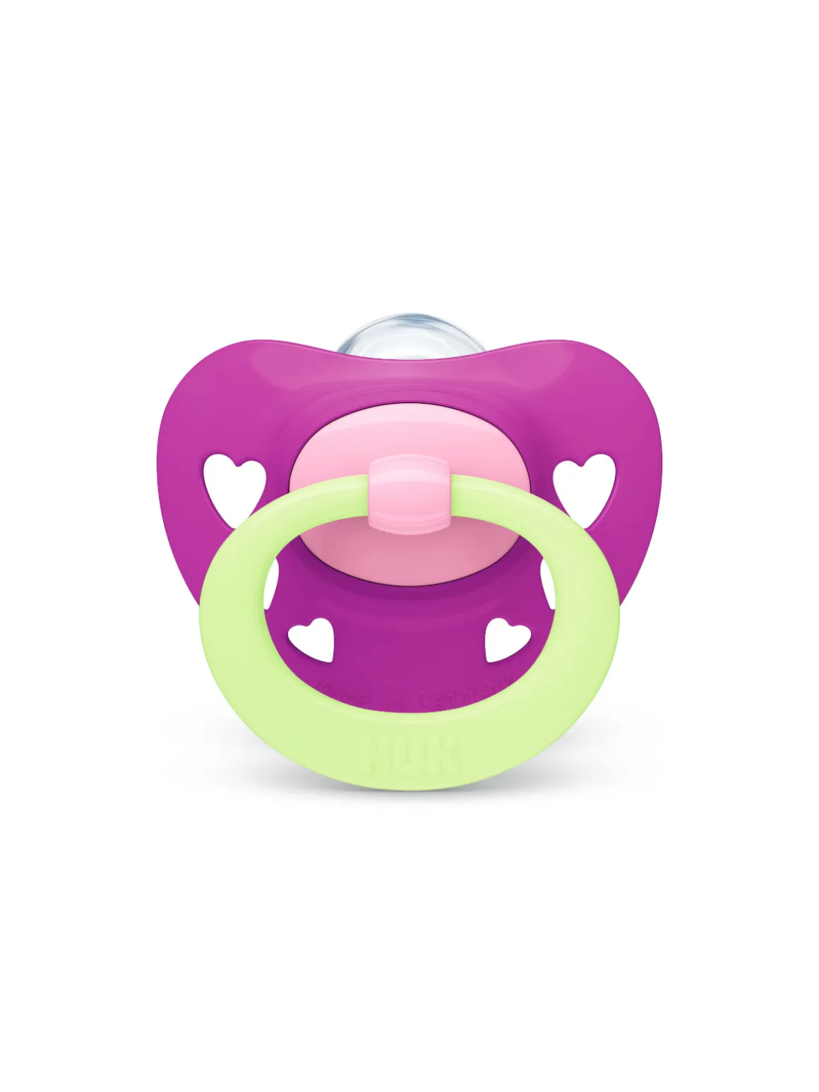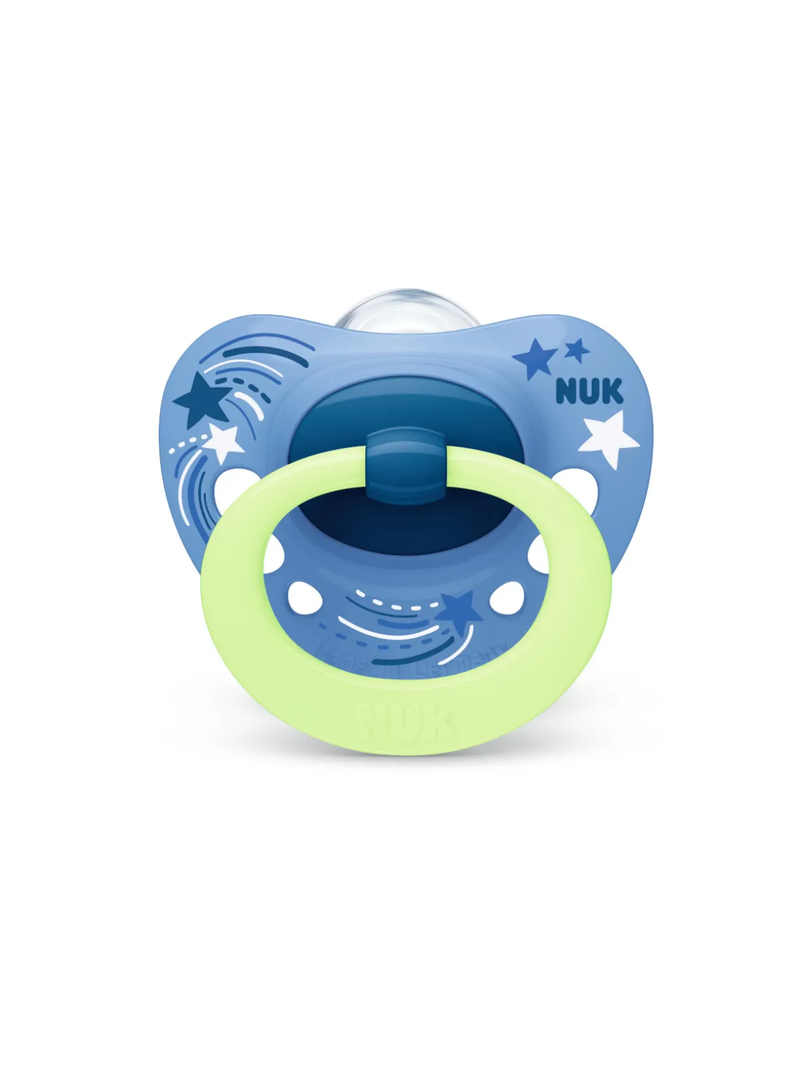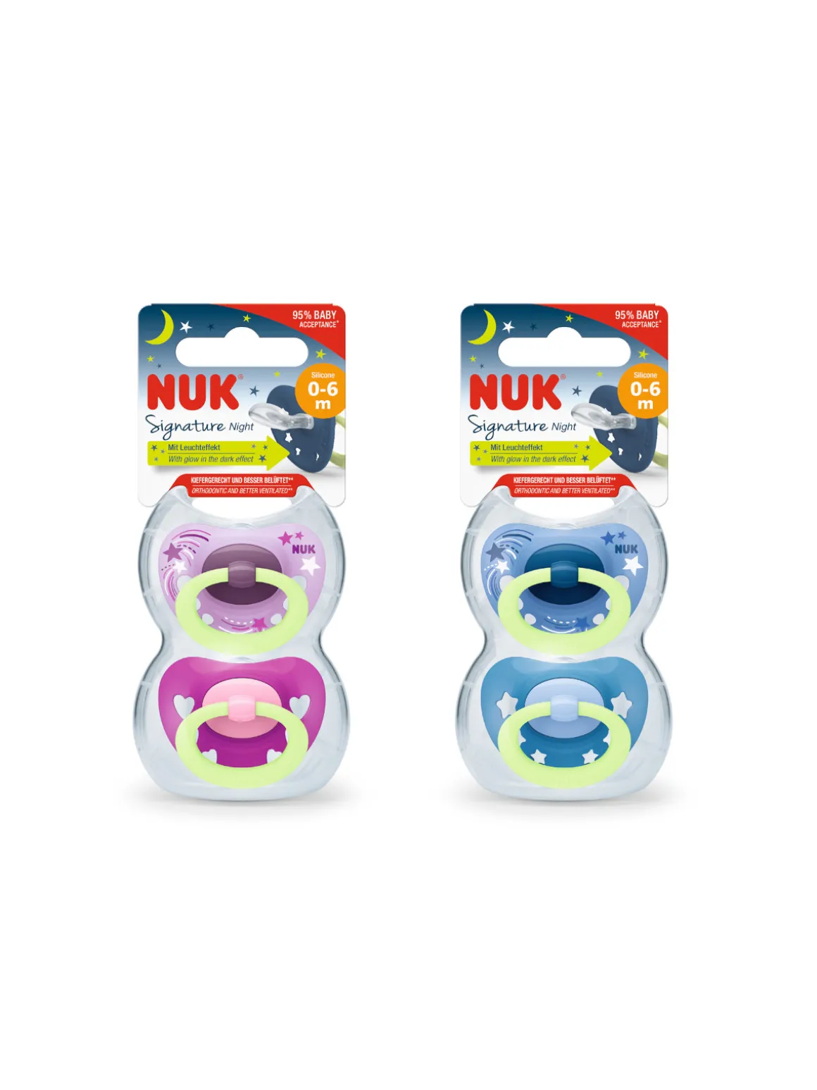 Il collo stretto e sottile riduce la pressione sui denti e sulla mandibola. La testa più piatta e liscia sul fondo della tettina favorisce il naturale movimento di suzione, lasciando ampio spazio nella bocca del bambino e i fori sullo scudo garantiscono il passaggio dell’aria durante la suzione. In tutti i succhietti è presente una valvola NUK Air System che lascia uscire l’aria dalla tettina, aiutando a prevenire le malformazioni della mandibola e le coliche. L’edizione speciale Glow in the Dark permette di trovare facilmente il succhietto anche al buio.