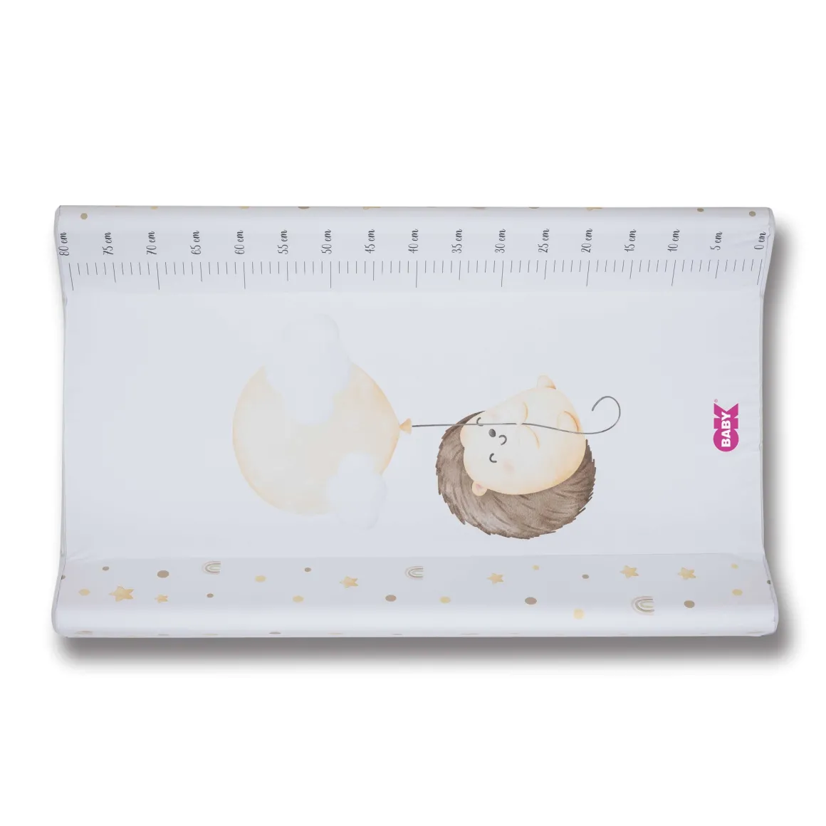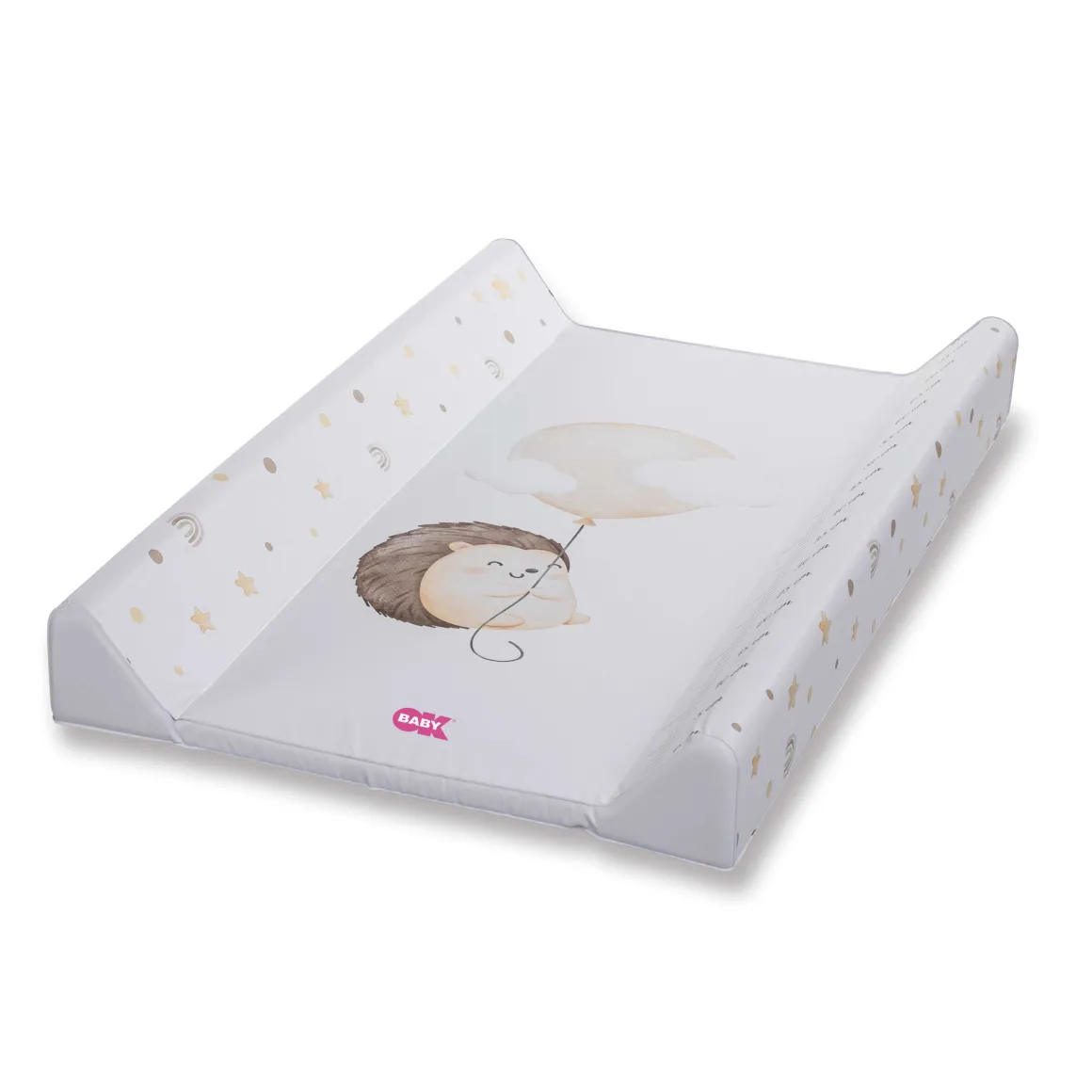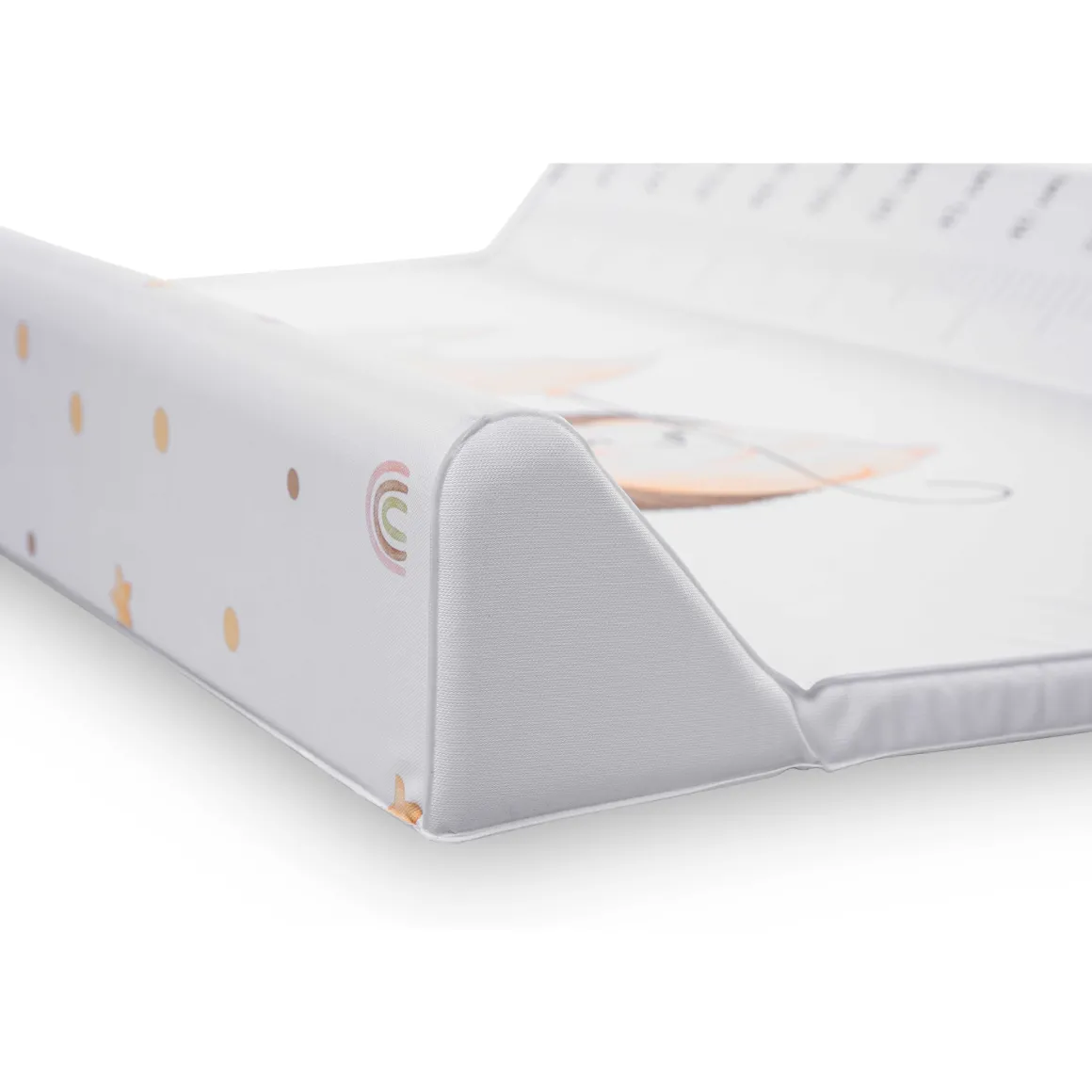 Soffice materassino dotato di due sponde laterali,facile da pulire e molto morbido, con un metro disegnato per seguire la crescita del bambino. In pvc atossico.