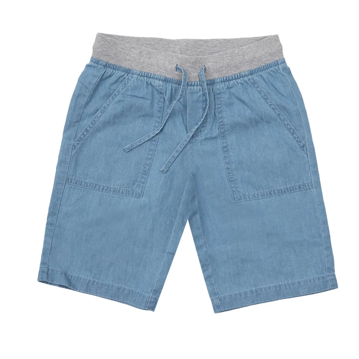 Calzoncino bermuda da bambino. Il capo si presenta in colorazione denim chiaro con fascia grigia in girovita. Modello con tasche grandi sul davanti. La vestibilià è morbida e pratica grazie a elastico regolabile in girovita. Accessori non in vendita. La confezione contiene solo il capo d’abbigliamento