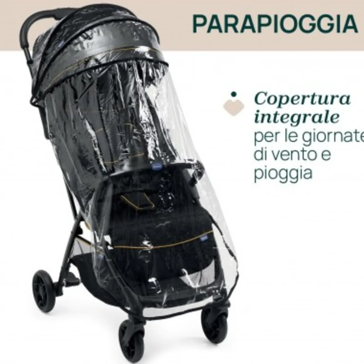 La cappottina di protezione presenta una parte estensibile ed è dotata di parasole. La stessa viene sottoposta a trattamenti UV50+ e idrorepellenti.