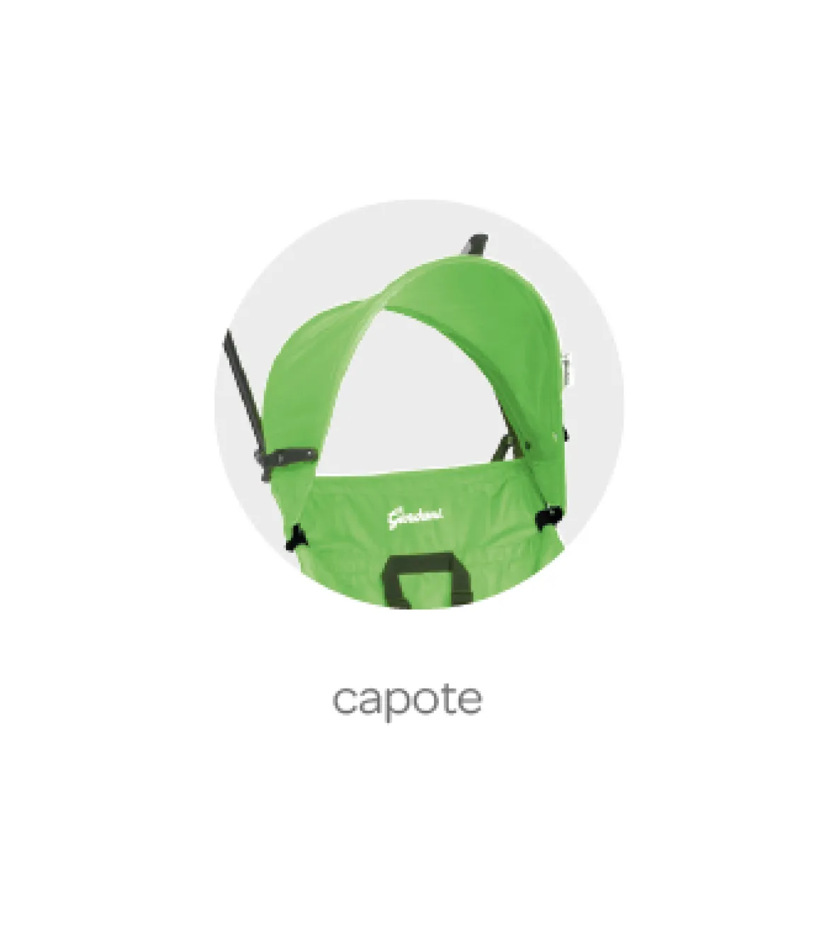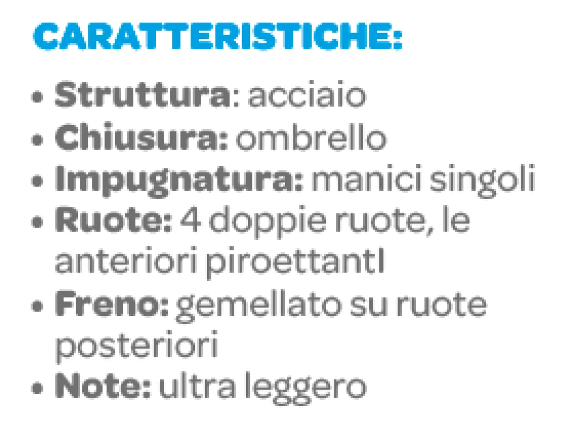 Jolly è un passeggino semplice, ma completo: è dotato di ruote piroettanti anteriori non bloccabili, freno posteriore gemellato, capottina parasole e sistema di cinturine a cinque punti.