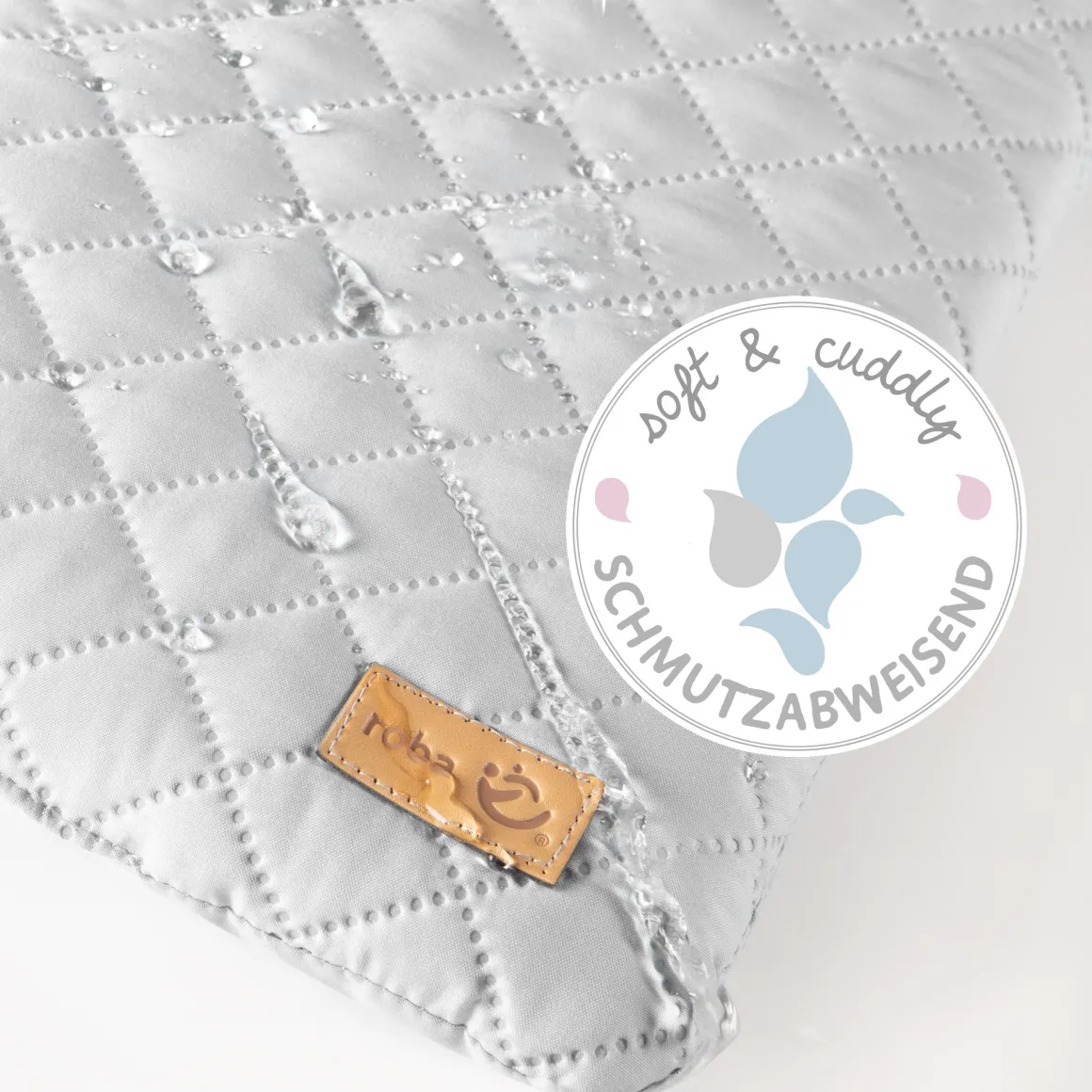 Il fasciatoio salvaspazio è perfetto per i genitori quando lo spazio a disposizione è poco. Posizionandolo semplicemente sui lettini70 x 140 cm, anche sulla lavatrice!, si ottiene immediatamente una superficie di cambio ampia e comoda. Il cuiscino ‘roba Style’ è incluso ; la superficie del materassino in microfibra trapuntata è resistente all’acqua e allo sporco ed è particolarmente delicata sulla pelle. Tutti i materiali utilizzati per il materassinosono privi di ftalati , testati per le sostanze nocive, certificati e vengono controllati regolarmente. La superficie del materassino per il cambio è lavabile e facile da pulire.