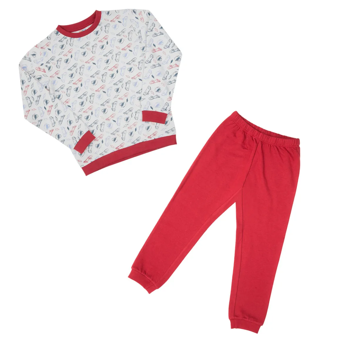 Pigiama due pezzi felpato da bambino. Il capo si compone di maglia a maniche lunghe bianca con stampa allover “skaters” e pantaloni in tinta unita rossi coordinati. La vestibilità è morbida e pratica grazie a elastico in girovita, su polsini, caviglie. Accessori non in vendita. La confezione contiene solo il capo d’abbigliamento