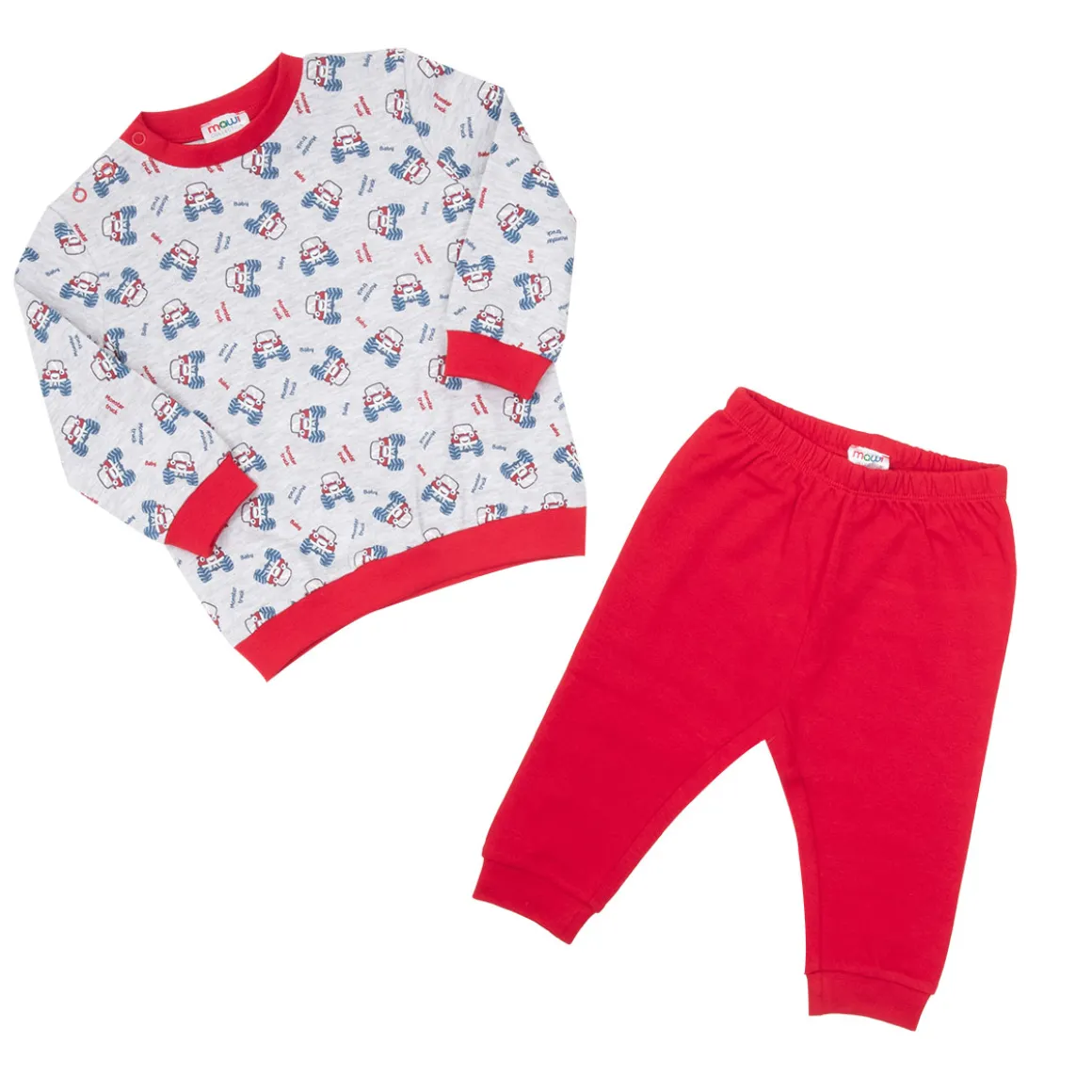 Pigiama due pezzi interlock da bambino. Il capo si compone di maglia a maniche lunghe grigia con stampa allover “auto” e pantaloni in tinta unita rossi coordinati. La vestibilità è morbida e pratica grazie a elastico in girovita, su polsini, caviglie e a bottoni a clip ad altezza girocollo. Accessori non in vendita. La confezione contiene solo il capo d’abbigliamento