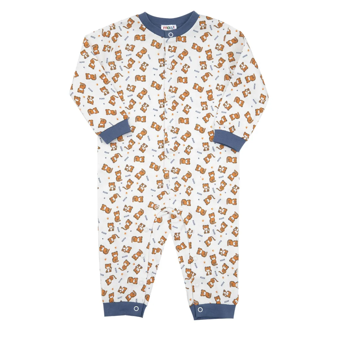 Tenero pigiama intero da bambino. Il capo si sviluppa su base bianco panna e particolari blu, presente stampa allover tigrotti coordinati. La vestibilità è morbida e pratica grazie a bottoni automatici sul davanti e sul cavallo. Accessori non in vendita. La confezione contiene solo il capo d’abbigliamento.