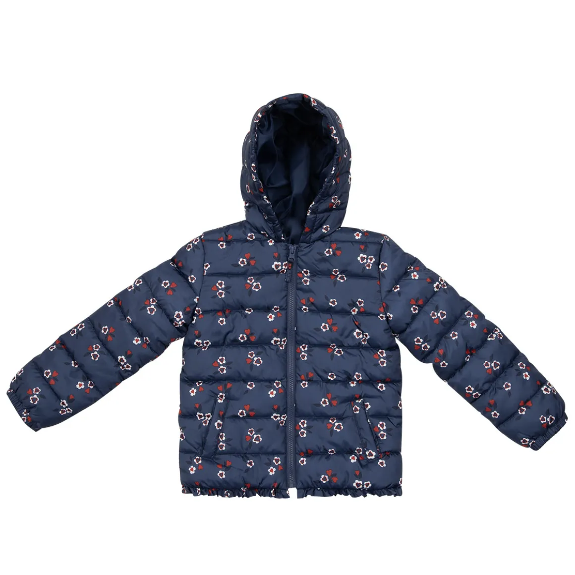 Piumino leggero da bambina con cappuccio. Il capo si sviluppa in blu scuro tinta unita ed è arricchito da una fantasia a fiorellini allover a contrasto. Modello con tasche. Chiusura frontale con zip.