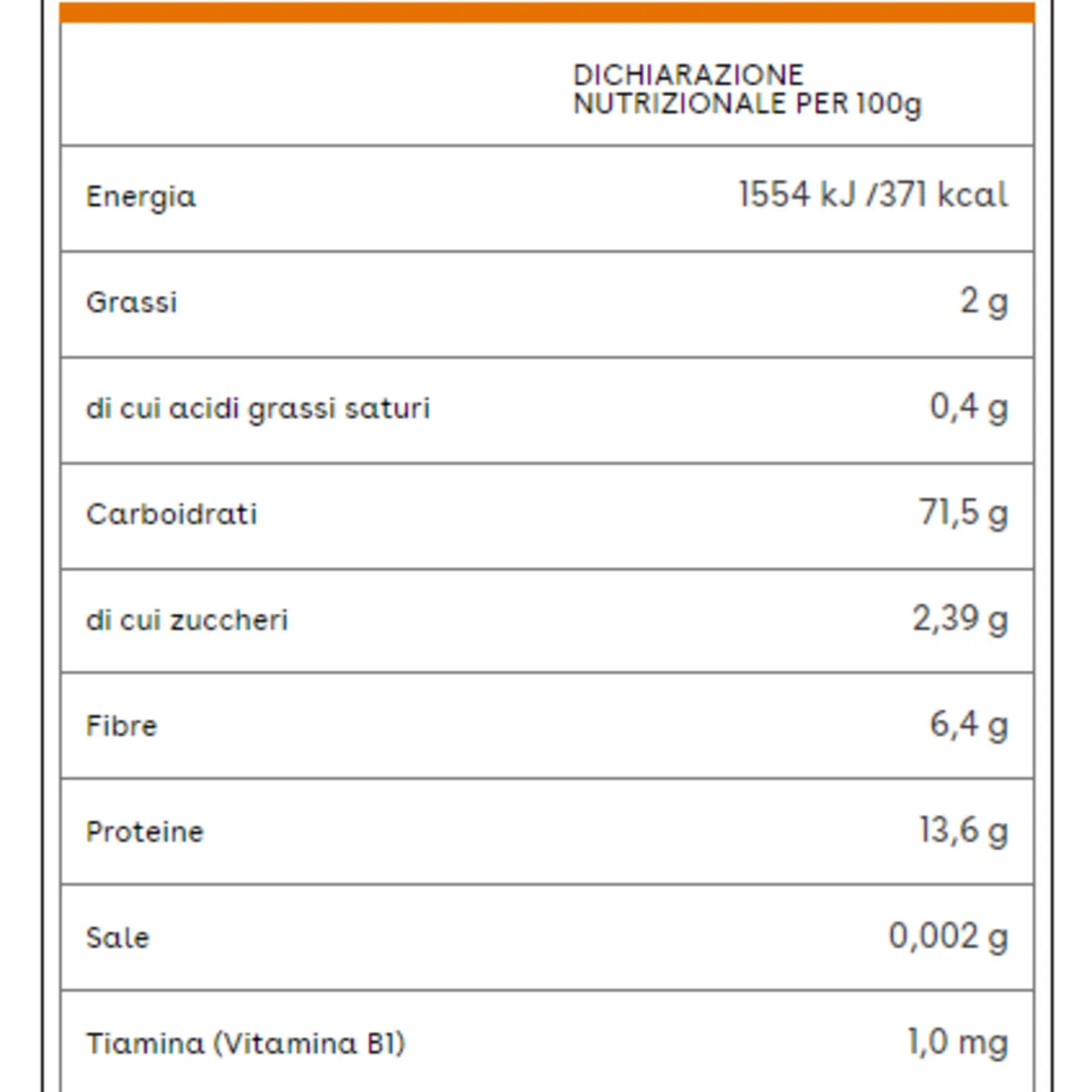 Ingredienti:Farine di cereali (farro* (50%), semola di grano duro* (50%)), tiamina. *Da agricoltura biologica.