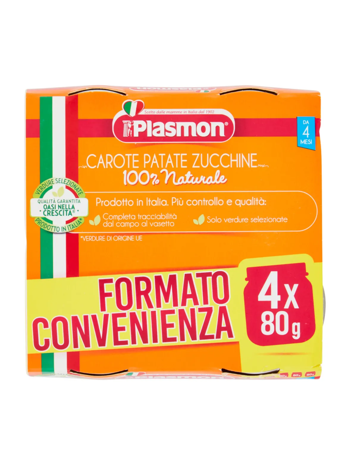 Alimento per l’infanzia omogeneizzato Carote-Patate-Zucchine. Prodotto indicato a partire dal 6° mese compiuto, salvo diverso parere del Pediatra. – Omogeneizzato di verdura – Prodotto sterilizzato. Non usiamo coloranti, né conservanti, come per legge sugli alimenti per l’infanzia. Senza sale aggiunto. .Confezione da 320 g (4 vasetti da 80g cad.)