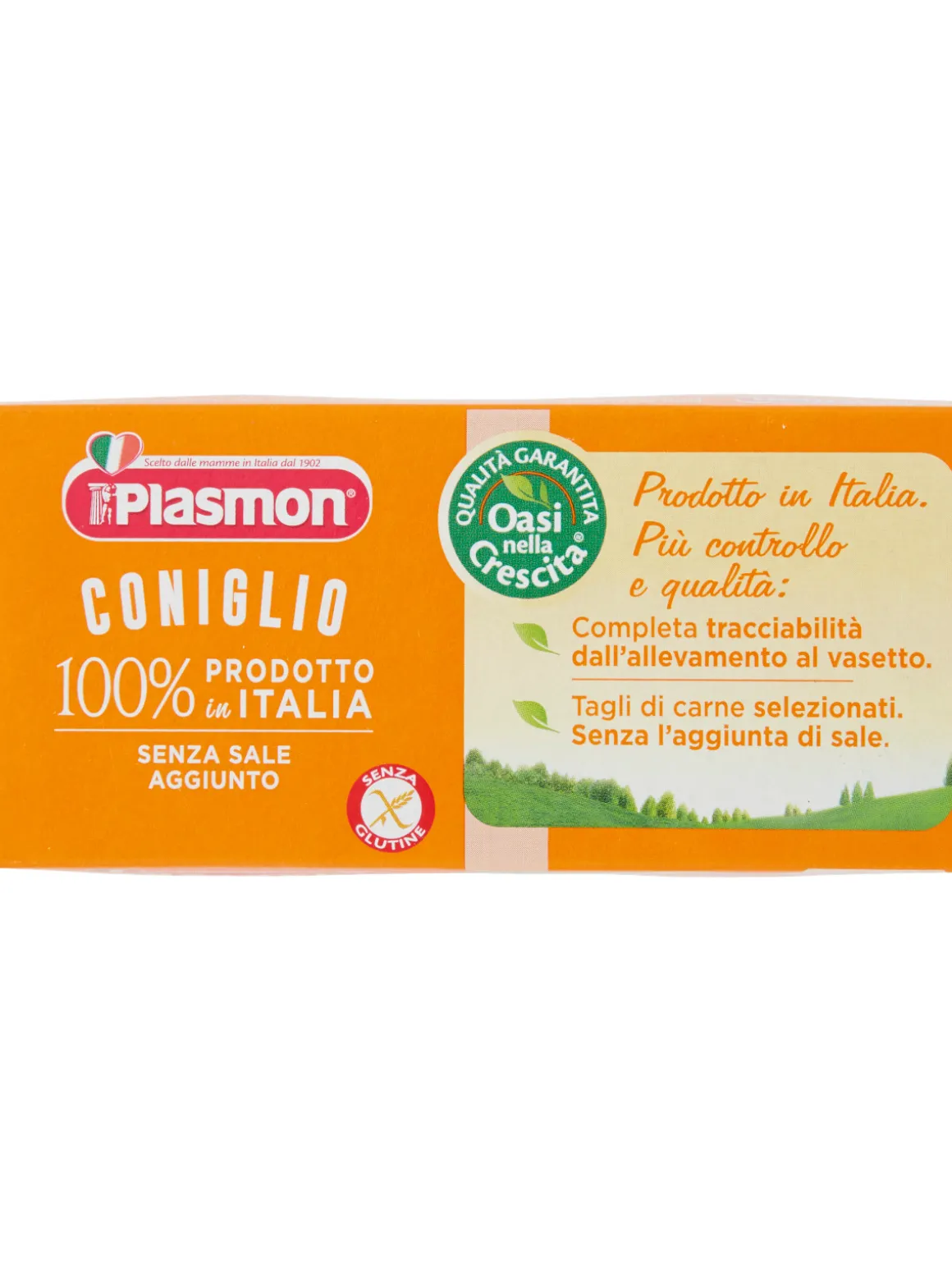 Prodotto omogeneizzato con carne di coniglio. Prodotto indicato a partire dal 4° mese compiuto, salvo diverso parere del Pediatra. – Omogeneizzato di carne – Prodotto sterilizzato; Non usiamo coloranti, né conservanti, come per legge sugli alimenti per l’infanzia. Senza sale aggiunto. .Confezione da 160 g (2 vasetti da 80g cad.)