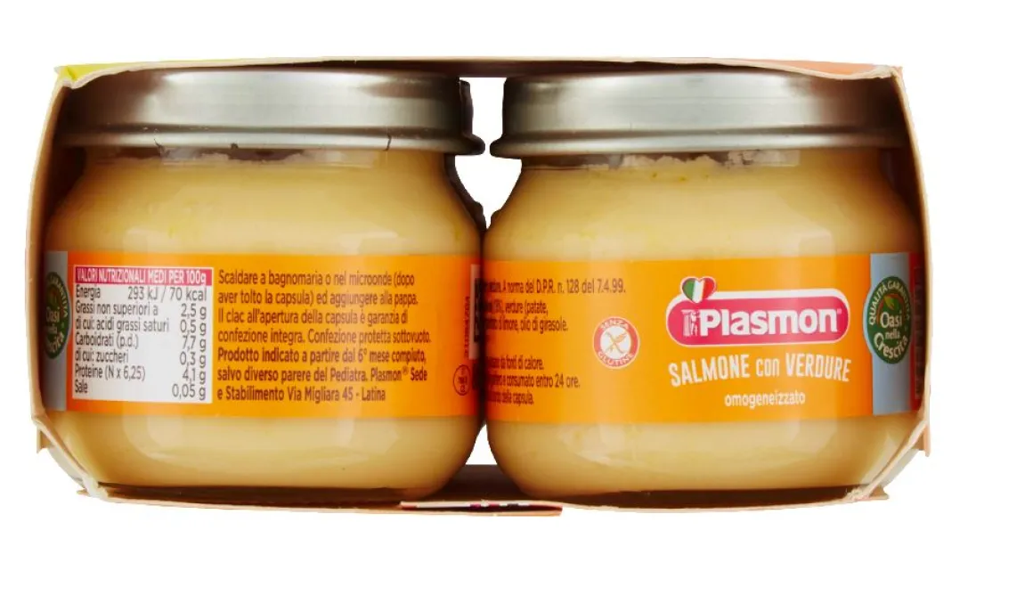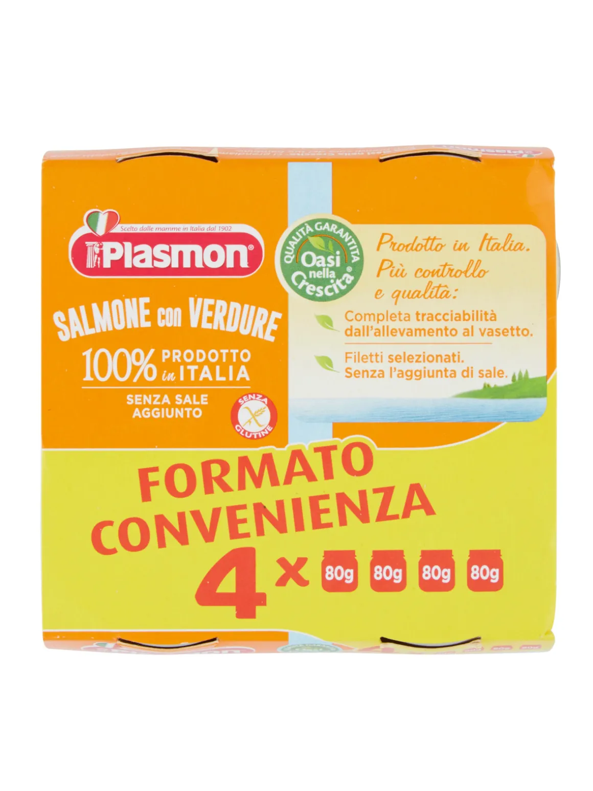 Alimento per l’infanzia omogeneizzato Salmone e Verdure. Prodotto indicato a partire dal 6° mese compiuto, salvo diverso parere del Pediatra. – Omogeneizzato di pesce – Prodotto sterilizzato; Non usiamo coloranti, né conservanti, come per legge sugli alimenti per l’infanzia. Senza sale aggiunto. .Confezione da 320 g (4 vasetti da 80g cad.)