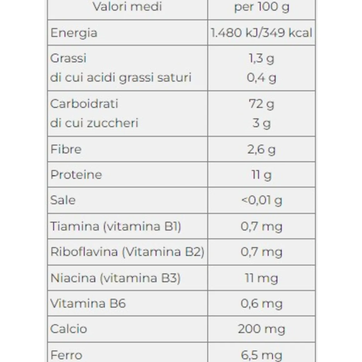 Farina di grano tenero (99,5%), carbonato di calcio, fumarato ferroso, niacina, riboflavina, tiamina, vitamina B6.