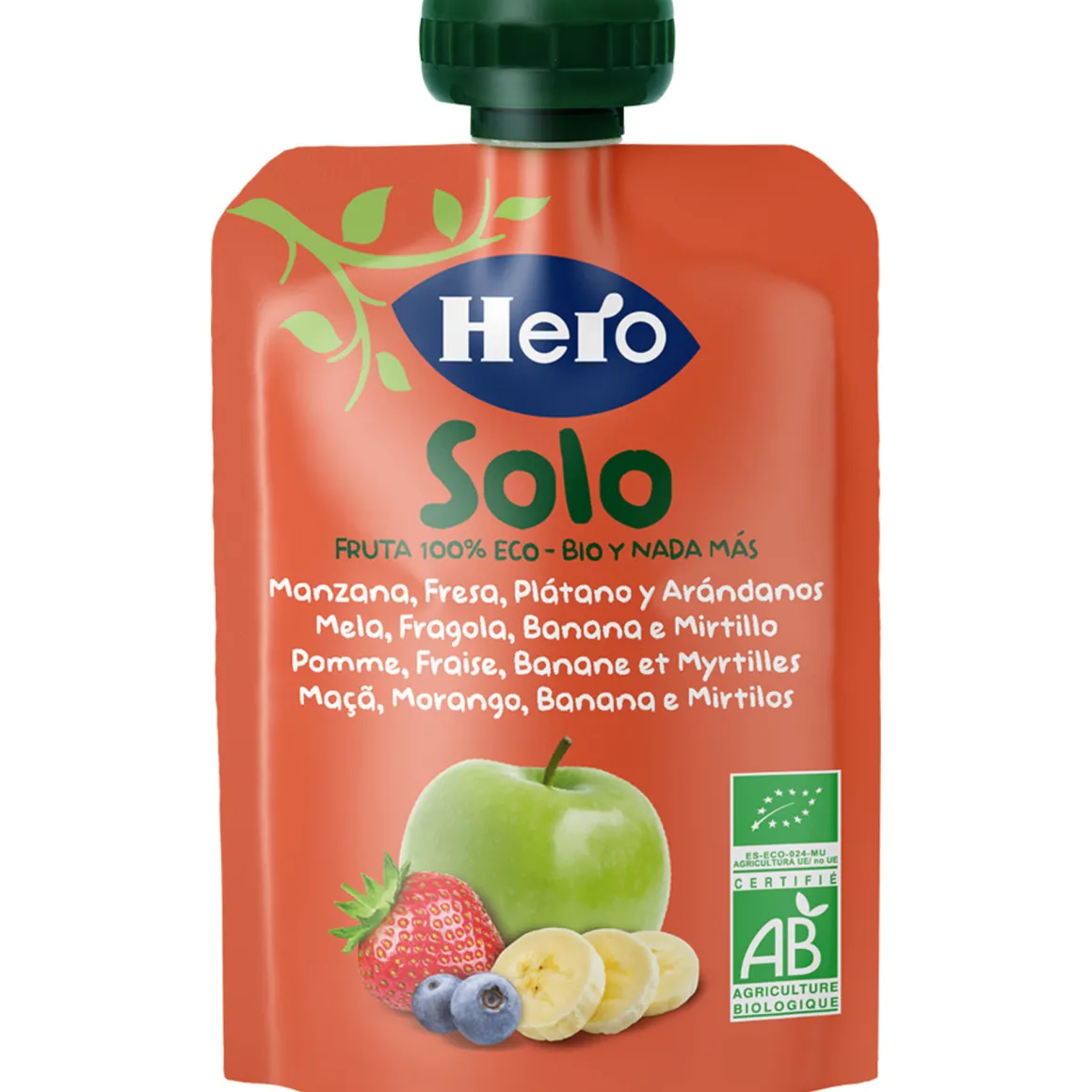 Frutta Frullata Mela, Fragola, Banana e Mirtilli Hero Solo è fatto con solo mela, fragola, banana e mirtilli biologici. Senza zuccheri aggiunti e senza glutine. A partire dai 4 mesi. Hero Solo mela, fragola e banana è una deliziosa merenda che puoi portare sempre con te, grazie alla pratica confezione tascabile e richiudibile.