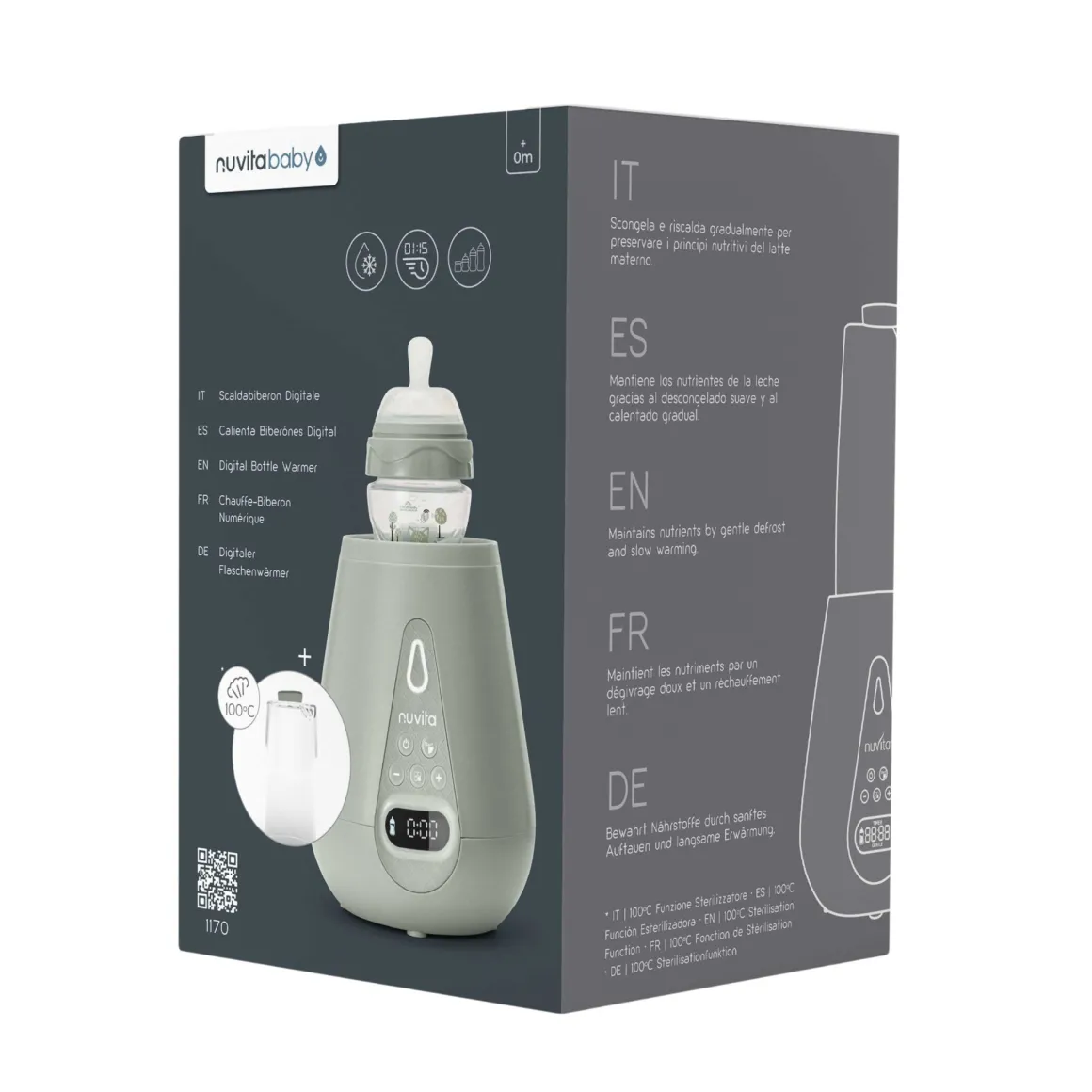 Scalda il biberon in solo 1 minuto e 15 secondi (60 ml a temperatura ambiente), il tempo più veloce della sua categoria. Ideale per il latte artificiale e le pappe.