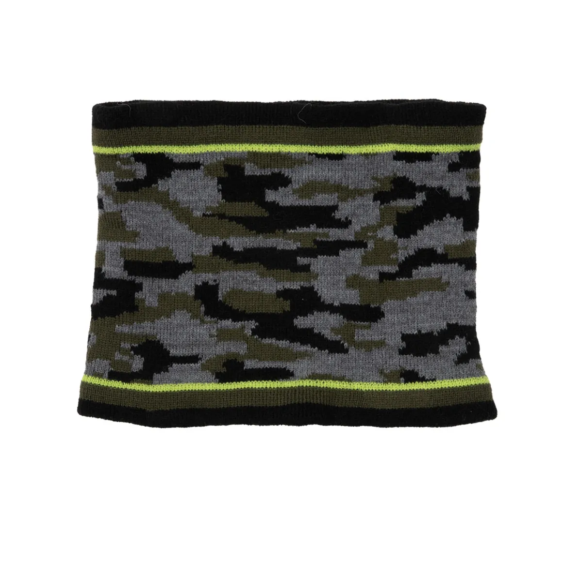 Scaldacollo da bambino. Il capo si presenta in colorazione multicolor mimetica con particolari gialli. Il cappello risulta morbido e ben coprente. Accessori non in vendita. La confezione contiene solo il capo d’abbigliamento
