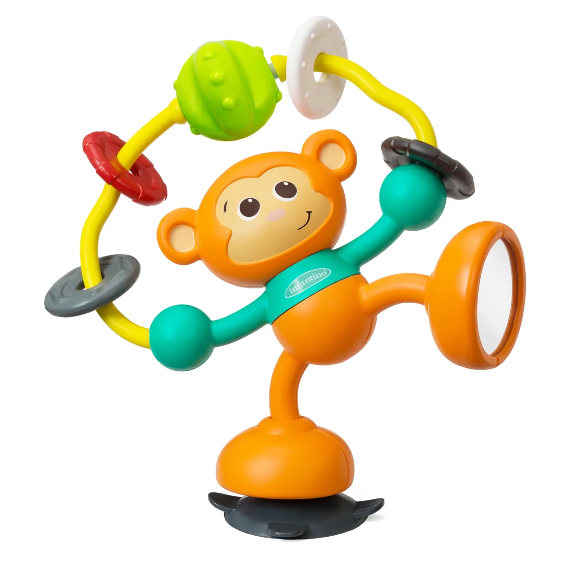 Scimmietta con ventosa sulle gambe per essere fissata facilmente al tavolo o al seggiolone. Con parti snodabili, anelli per il gioco e specchietto su una gamba.