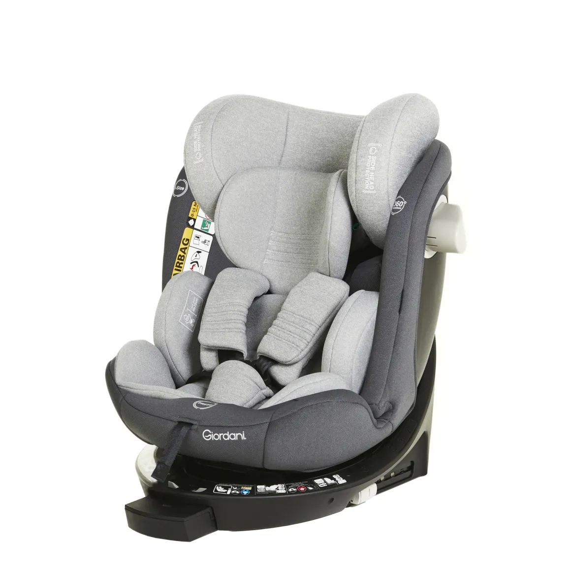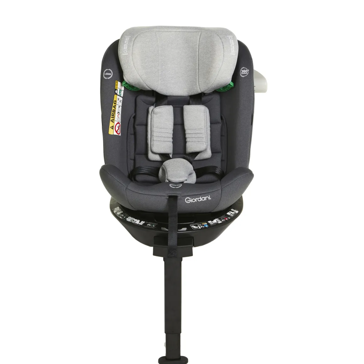 Il seggiolino auto Crono di Giordani è dotato di connettori isofix e gamba di supporto (support leg), oltre che della rotazione della seduta di 360° per una agevole posizionamento del bambino nel seggiolino.