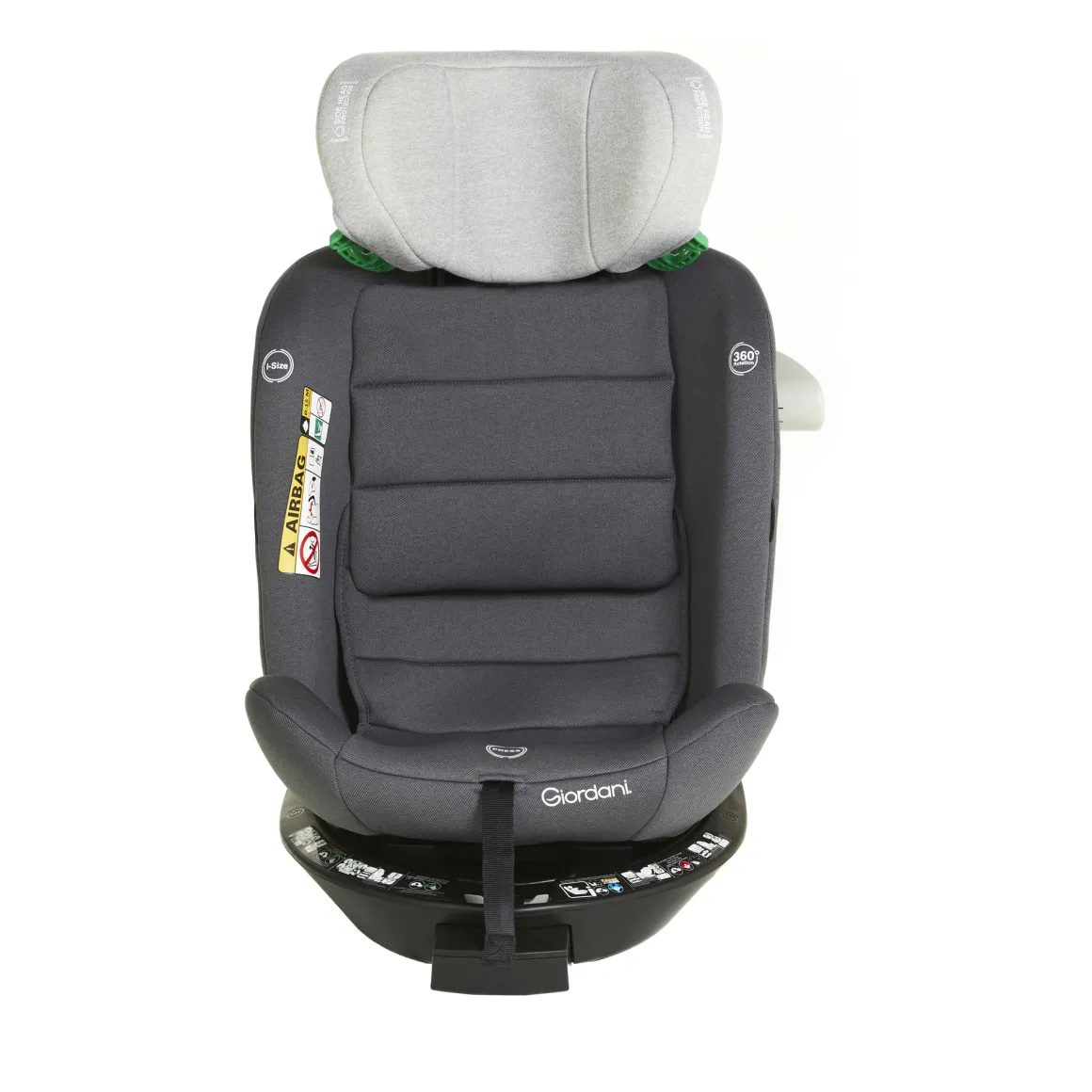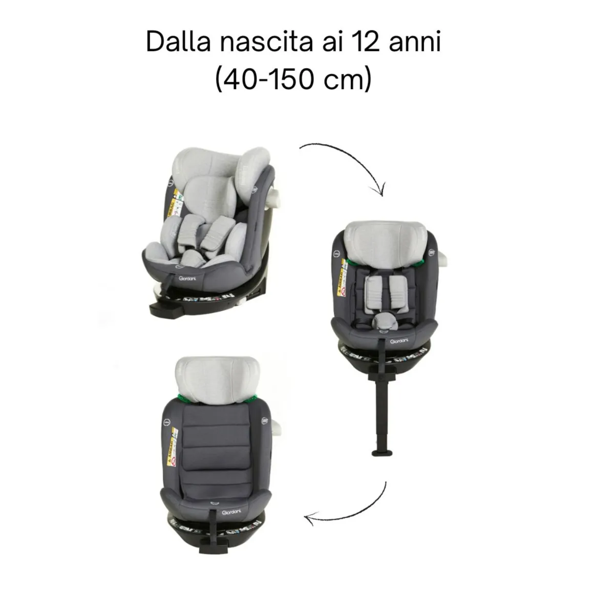 Seggiolino auto I-Size, evolutivo, reclinabile, con base girevole.