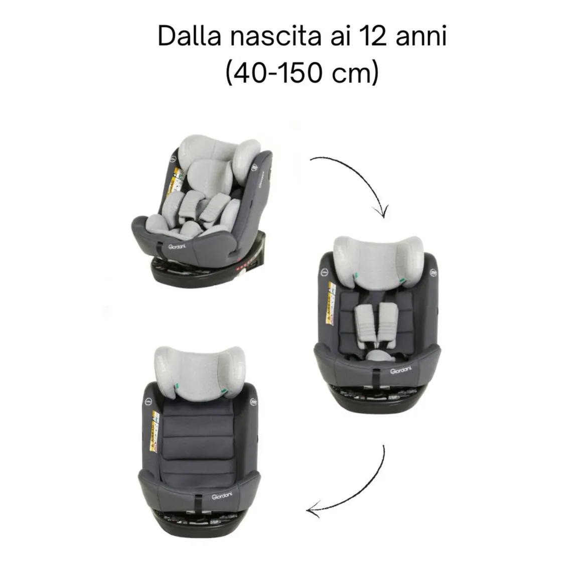 Seggiolino auto I-Size, evolutivo, reclinabile, con base girevole.