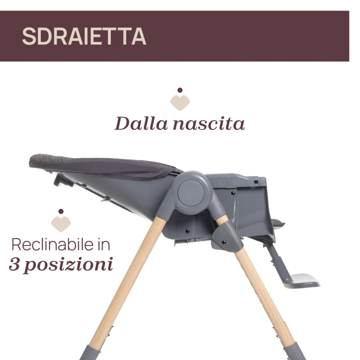 COMFORT DALLA NASCITA: lo schienale può essere reclinato in 3 diverse posizioni per utilizzarlo fin dai primi giorni o per rilassarsi dopo i pasti