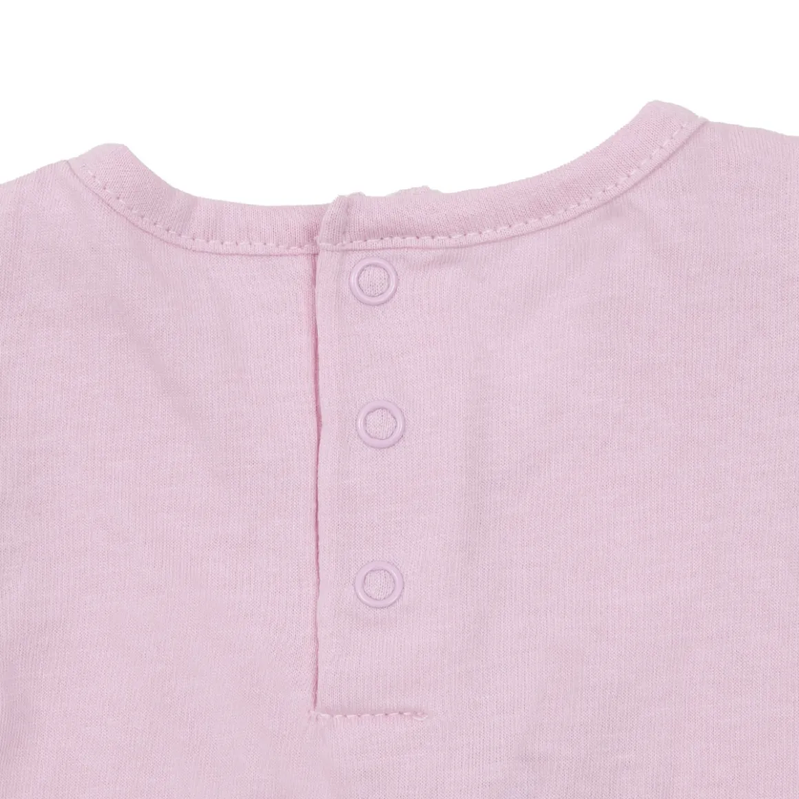 Canotta e shorts jersey da bambina. Il capo superiore si presenta in rosa con stampa simpatica sul davanti, rouches sul giromanica e comodi bottoni a clip sul retro per massimizzare la comodità e la praticità; il capo inferiore abbinato si presenta di colore giallo con rouches sul girogamba e comodo elastico regolabile in girovita.