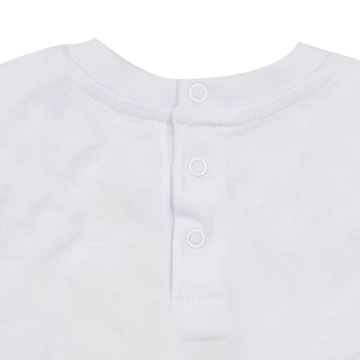 Canotta e shorts jersey da bambino. Il capo superiore si presenta in bianco con stampa simpatica sul davanti e comodi bottoni a clip sul retro per massimizzare la comodità e la praticità; il capo inferiore abbinato si presenta di colore verde chiaro con comodo elastico regolabile in girovita.