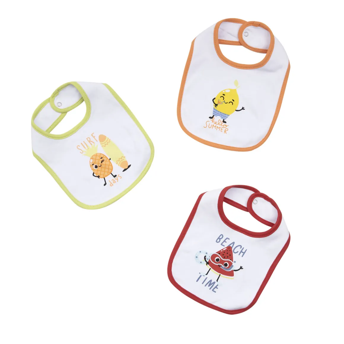 Pack 3 bavaglini bimbo su base bianco con disegnini in varie colorazioni coordinate. L’indossatura è pratica e sicura grazie a bottone a clip sul girocollo.