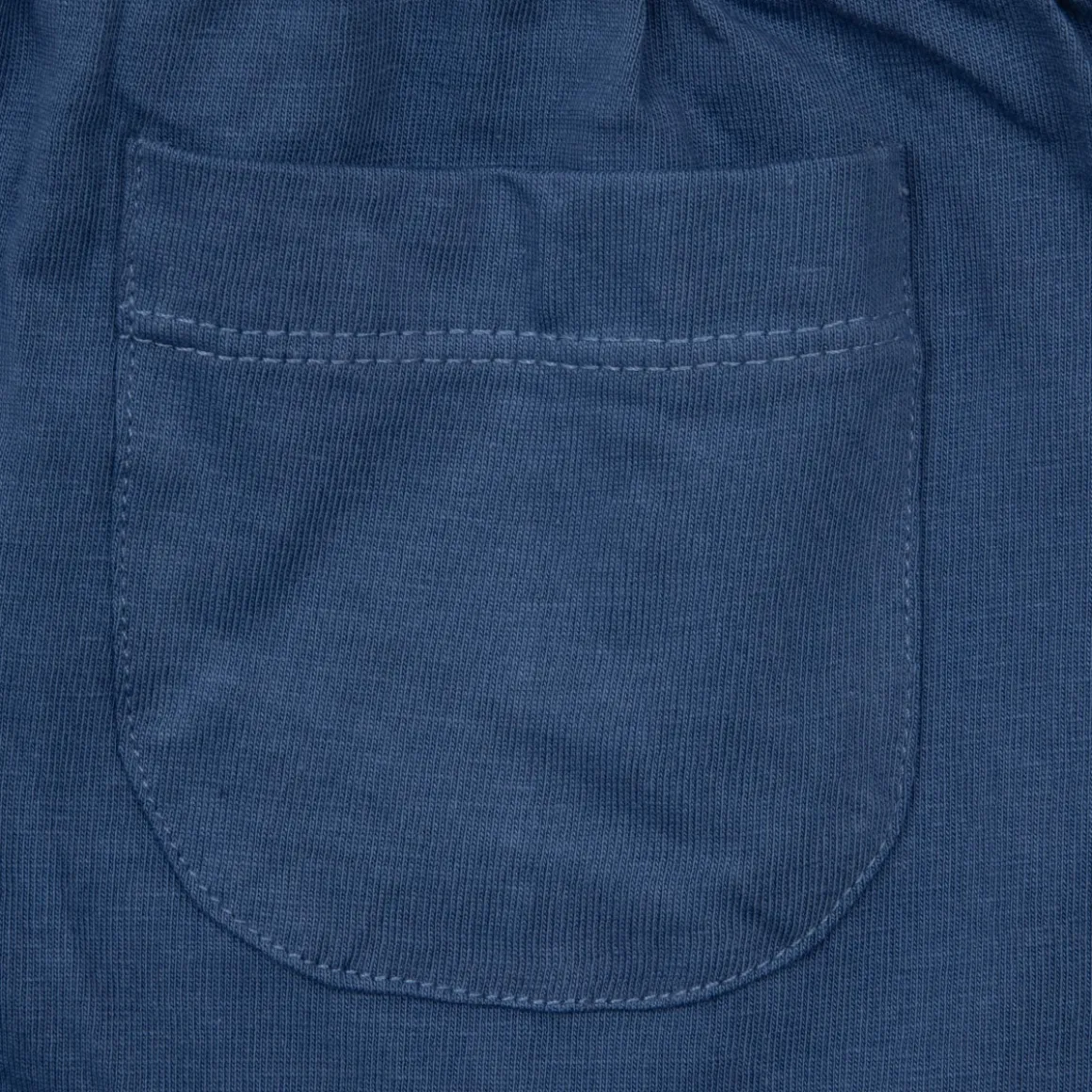 Set estivo da bambino composto da magliettina mezza manica e pantalcino morbido. Il capo superiore si sviluppa su base azzurra con stampa sul davanti; la parte inferiore si sviluppa in tinta unita blu con tasca posteriore. Modello girocollo. La vestibilità è morbida e pratica grazie a elastico in girovita regolabile