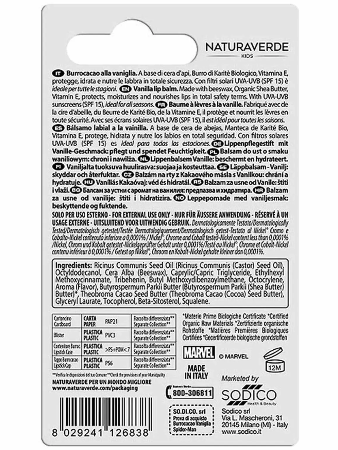 Il Burrocacao Kids Spider-man alla vaniglia, a base di cera d’api, Burro di Karitè Biologico, Vitamina E, protegge, idrata e nutre le labbra in totale sicurezza. Con filtri solari UVA-UVB (SPF 15) è ideale per tutte le stagioni.