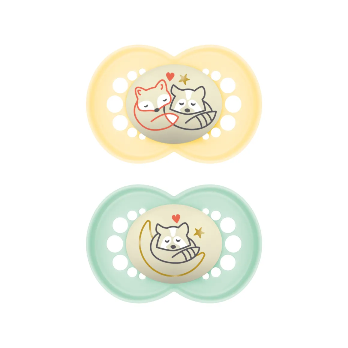 MAM Original Night ciuccio bambini in set da 2 – particolarmente delicato sulla pelle dei bimbi il set 2 ciucci mam original diverrà presto l’accessorio più amato tra quelli dei neonati. E’ realizzato in speciale silicone skinsoft dalla composizione talmente morbida e sicura che permette al 94% dei bambini di accettarlo in maniera istintiva.*