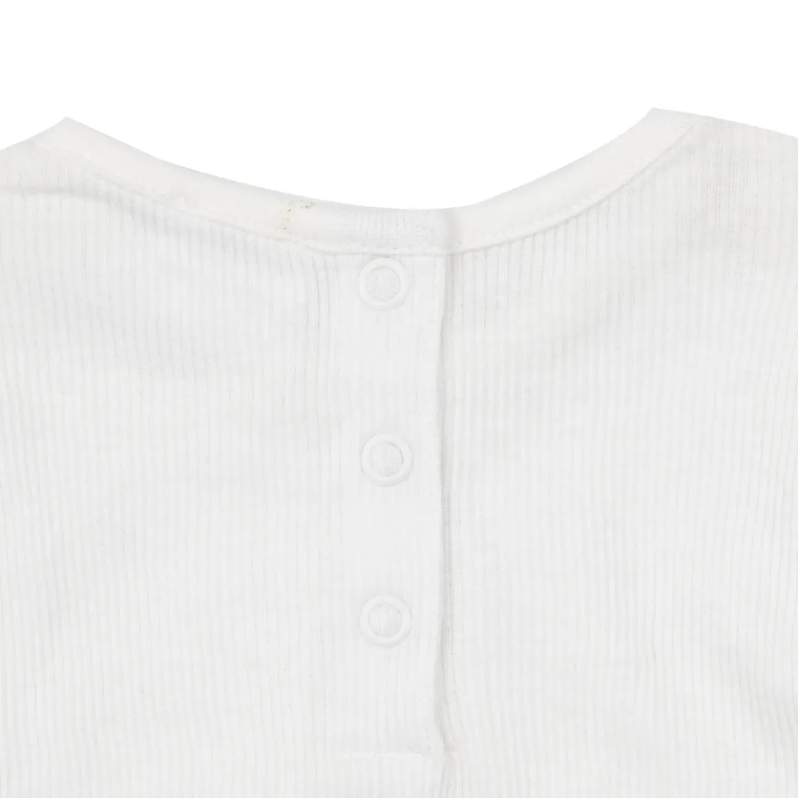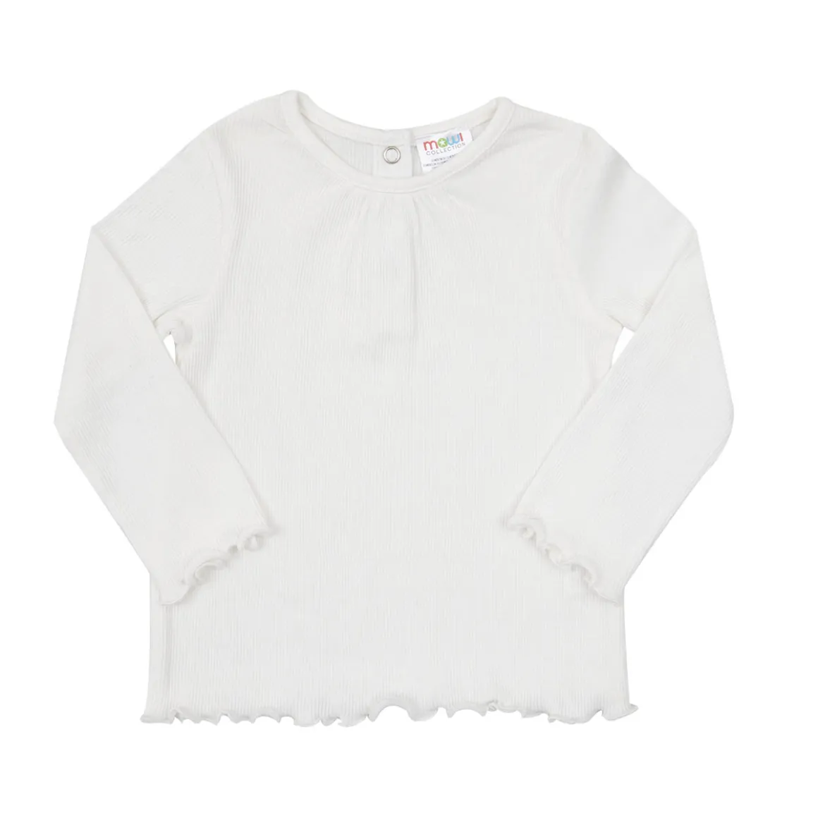 Basica t-shirt da bambina a coste. La t-shirt bianca a maniche lunghe presenta una leggera arricciatura nella parte frontale. Modello girocollo. Bordi ondulati. Chiusura con pratici bottoni sul retro. Vestibilità pratica e confortevole.