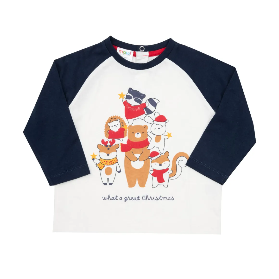 Casual t-shirt manica lunga jersey da bambino. Il capo bicolor ha una base bianco panna e maniche complete blu scuro; presente stampa a tema “Christmas”. La vestibilità è morbida e pratica grazie ai bottoni a clip sulla schiena. Accessori non in vendita. La confezione contiene solo il capo d’abbigliamento
