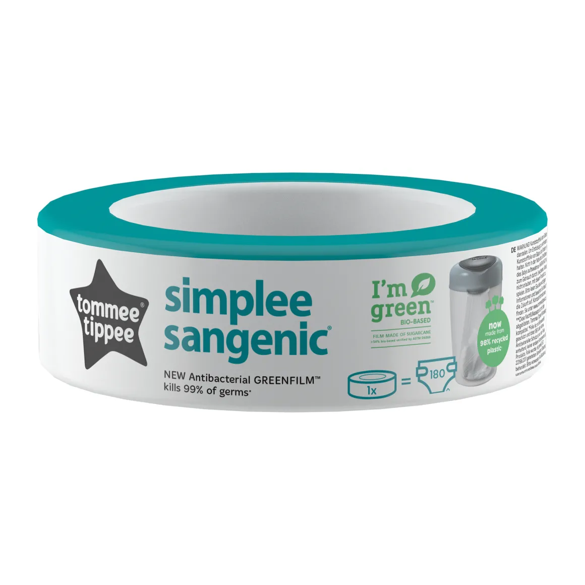 Per ridurre l’impatto ambientale, la struttura della ricarica del mangiapannolini Simplee Sangenic é realizzata al 100% di plastica reciclata e riciclabile e la pellicola multi-strato antibatterica GREENFILM é ora realiazzata da materiale biologico e zucchero di canna sostenibile.