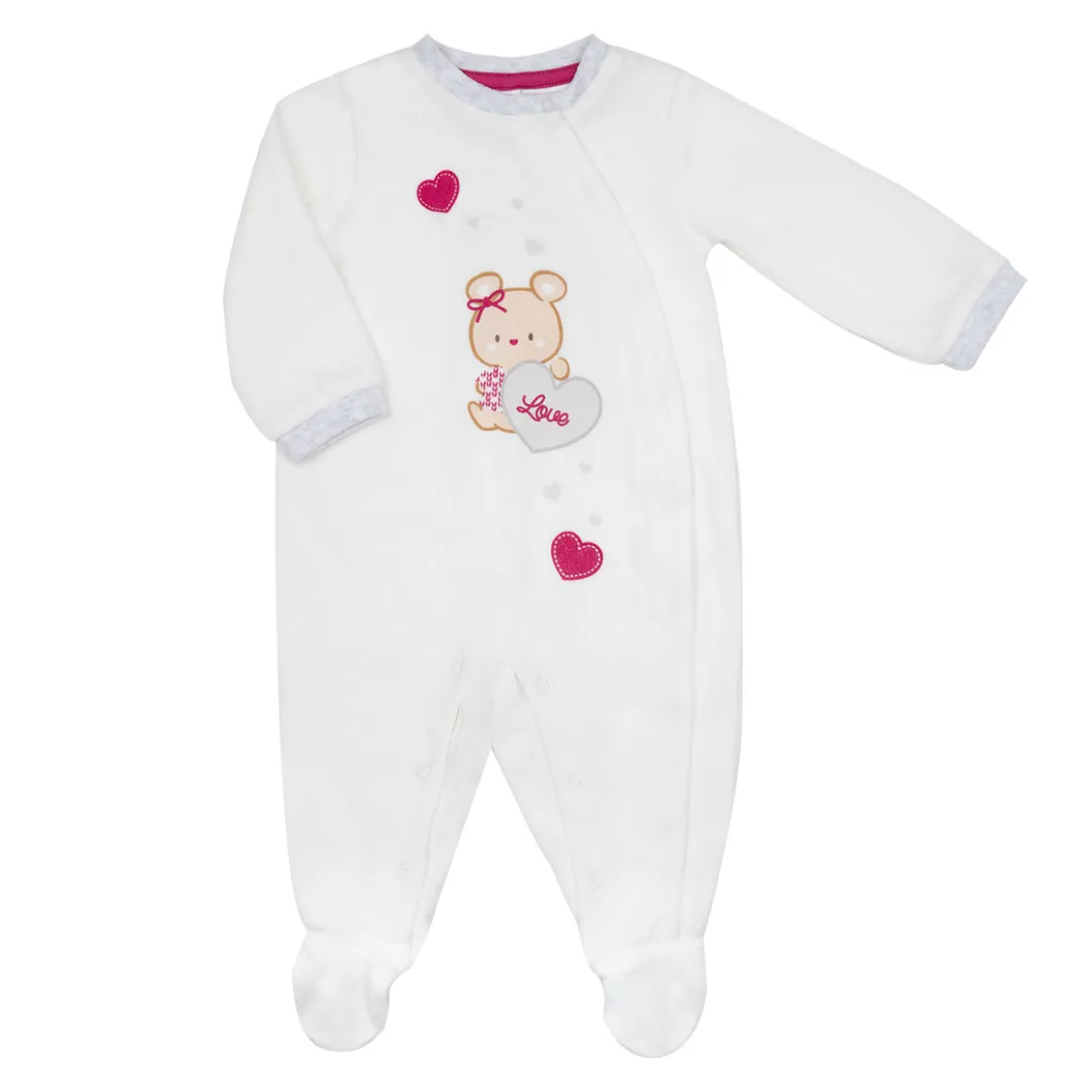 Tenera tutina ciniglia da bambina. Il capo si presenta in un pezzo unico con piedini color panna con stampa sul davanti “orsetto love”. La vestibilità è morbida e pratica grazie all’apertura sul davanti e sul cavallo con bottoni a clip. Modello girocollo. Il capo è in cotone oeko – tex, testato per sostanze nocive garantisce alta sicurezza. Accessori non in vendita. La confezione contiene solo il capo d’abbigliamento