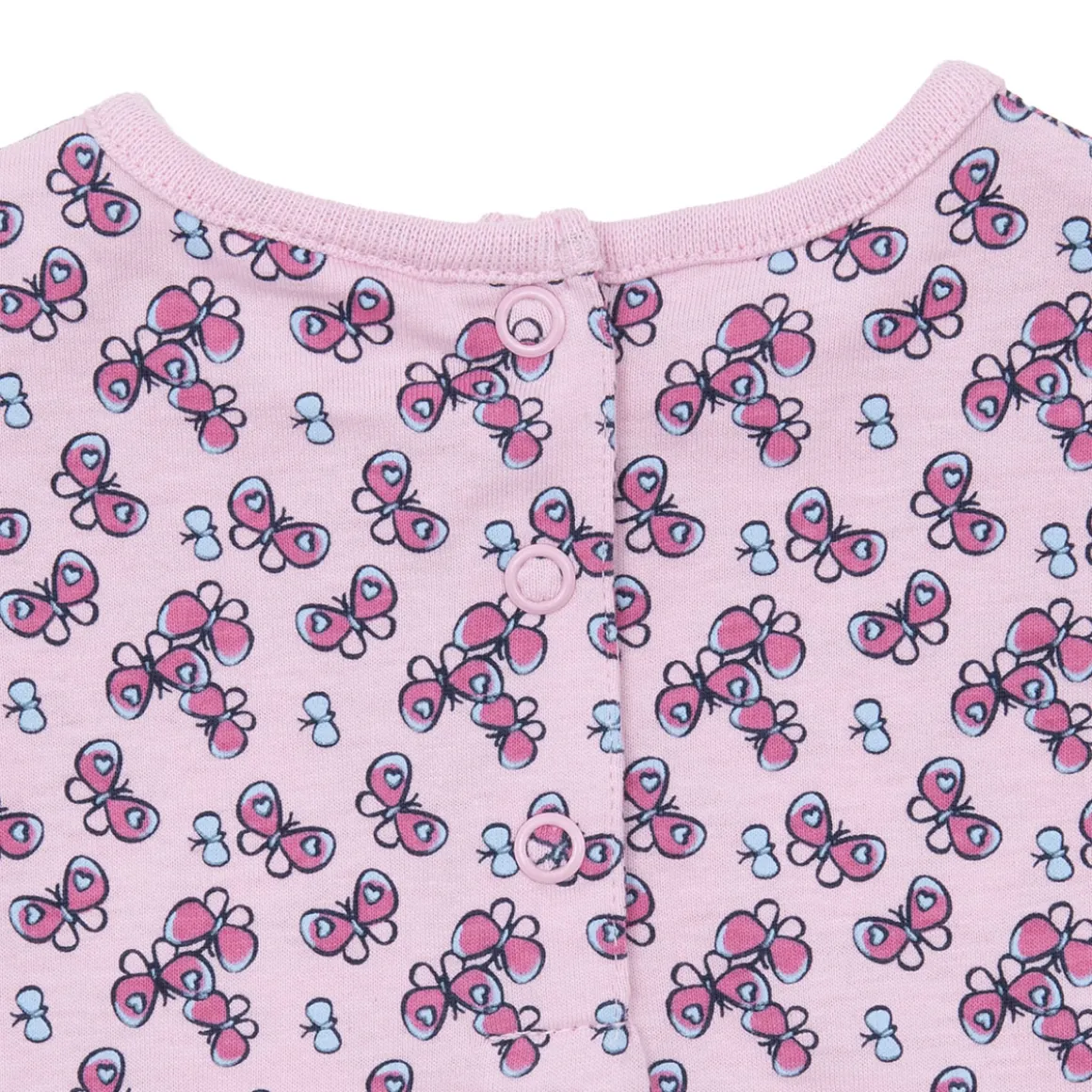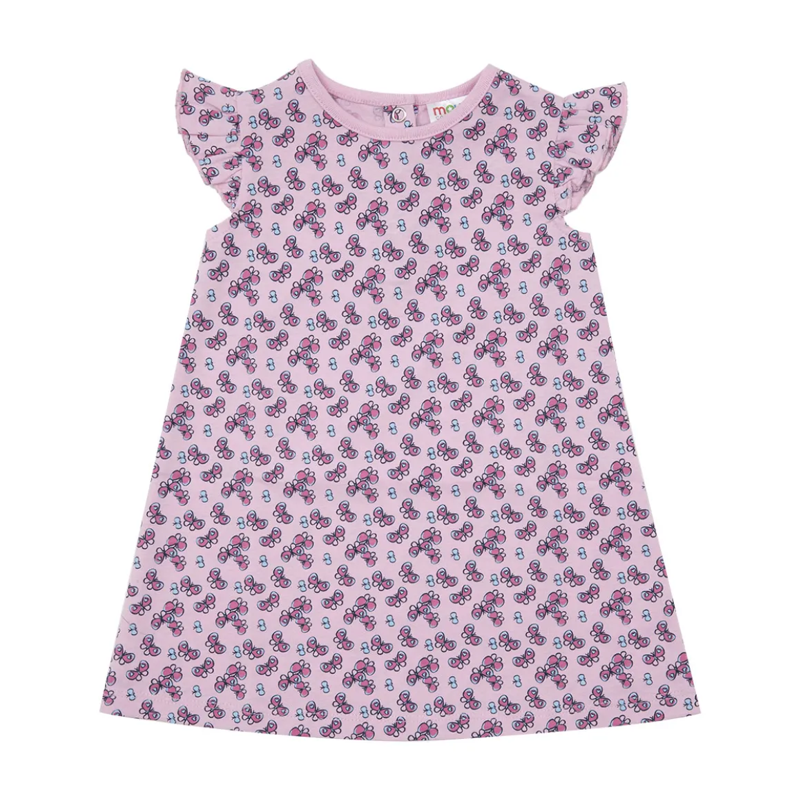Fresco vestito estivo da bambina. Il capo si presenta con fondo rosa e stampa allover farfalle, la trama continua per l’intera lunghezza. Modelllo a canottiera con rouches sul giromanica e gonna larga. La vestibilità è morbida e pratica grazie ai bottoni a clip sulla schiena.