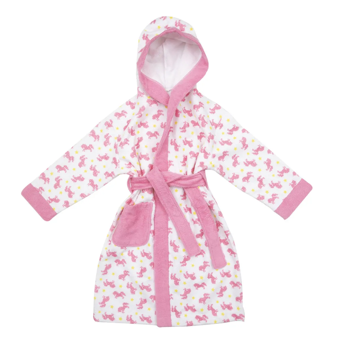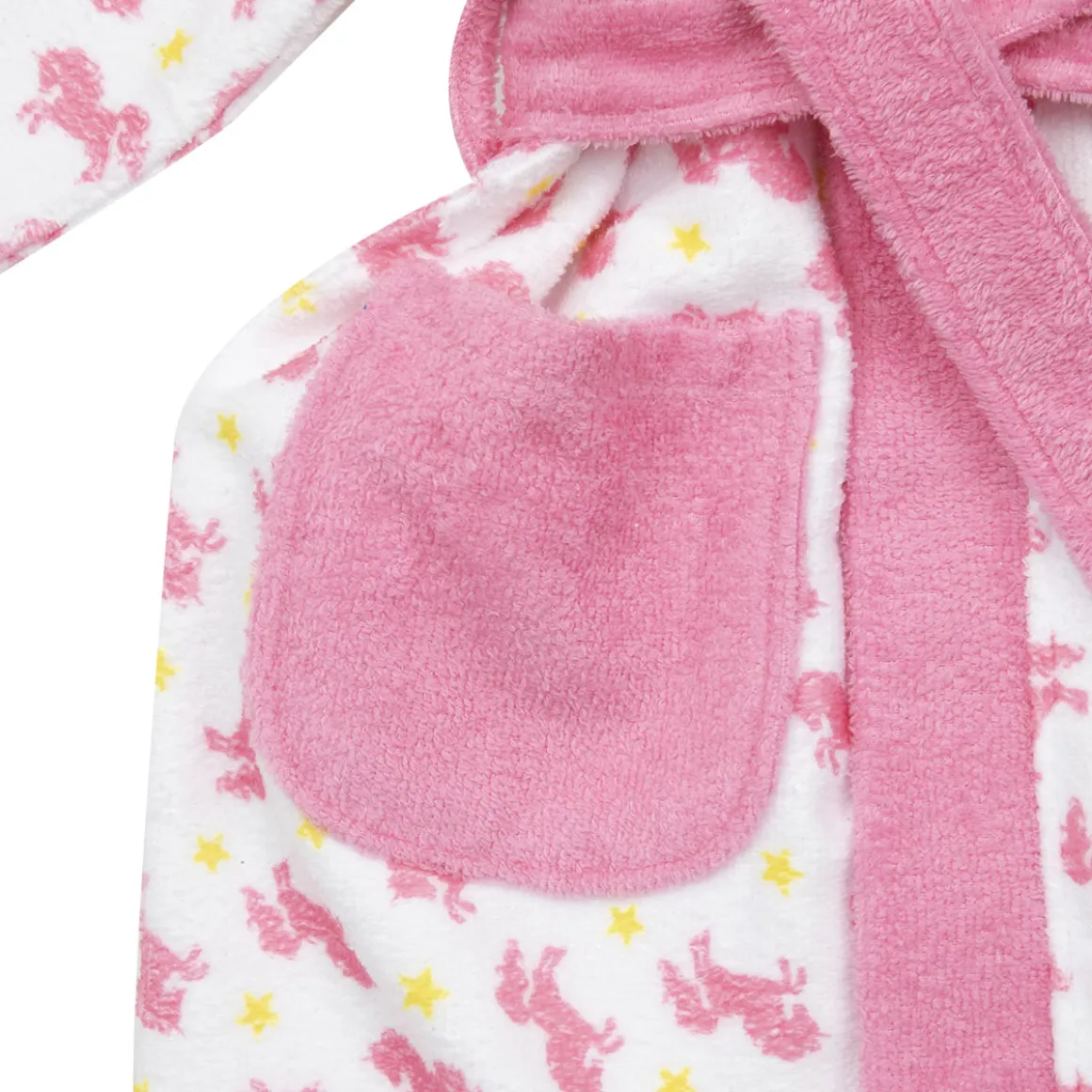 Accappatoio da bambino. Il capo si presenta in materiale assorbente in colorazione di fondo bianca, bordature rosa e stampa allover “Unicorno”. Presente cappuccio e tasca frontale. La vestibilità è morbida. Il capo è in cotone oeko – tex, testato per sostanze nocive garantisce alta sicurezza. Accessori non in vendita. La confezione contiene solo il capo d’abbigliamento