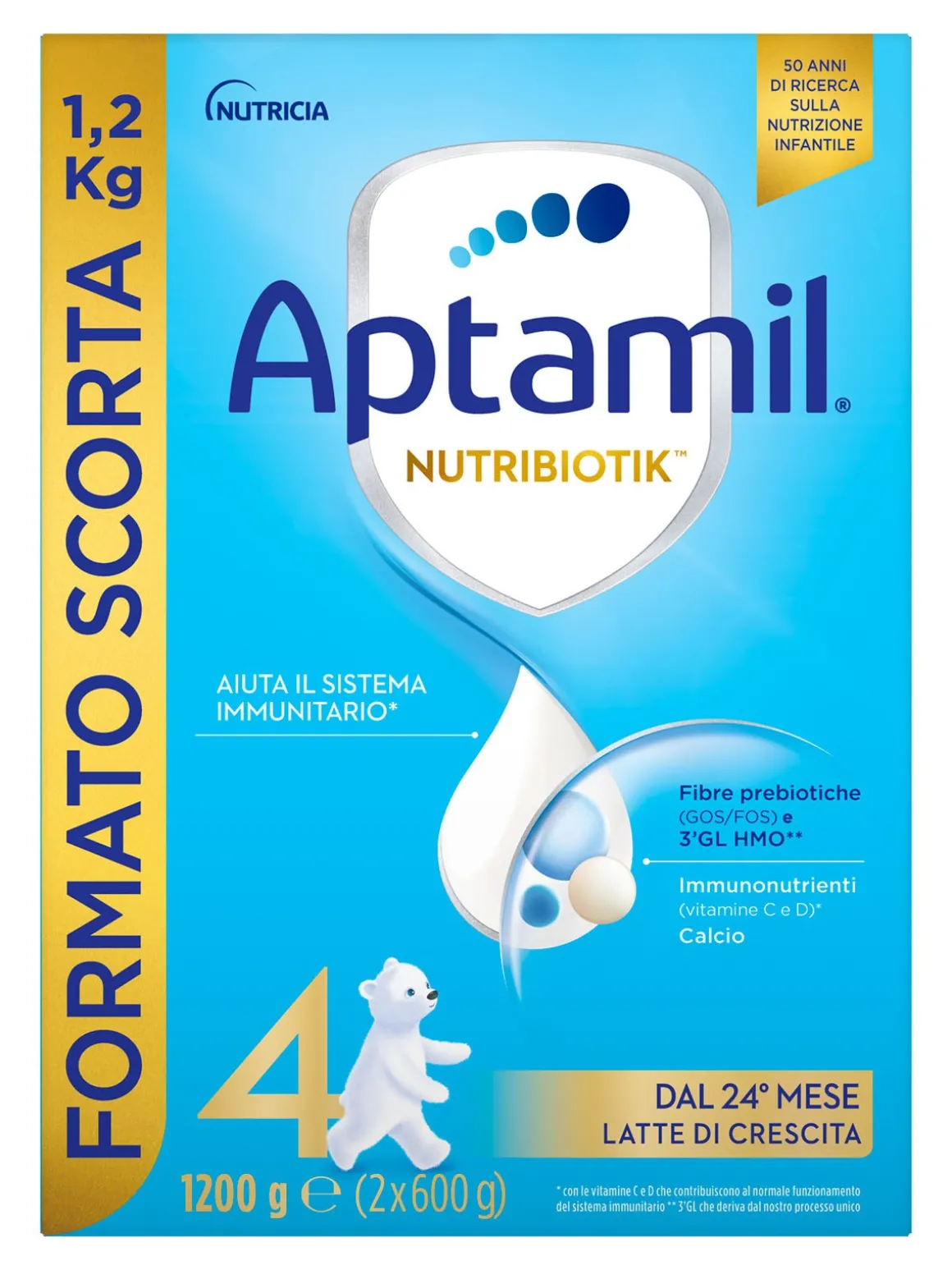 Latte crescita Aptamil Nutribiotik 4 in polvere destinato ai bambini dal 12° mese compiuto al 24°, nel formato convenienza da 1,2 kg.