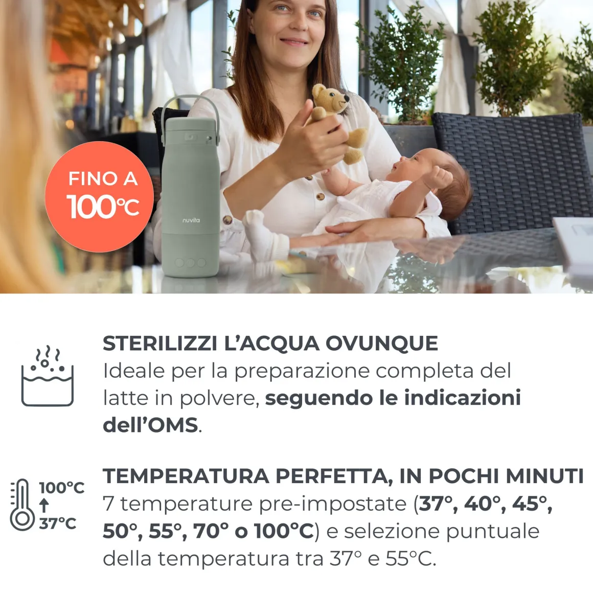 Hot’n’Go è l’unico che ti permette di portare l’acqua da 20°C fino a 100°C, senza fili. Ideale per la preparazione completa del latte in polvere, seguendo le indicazioni dell’OMS.