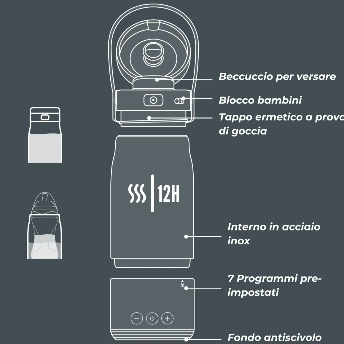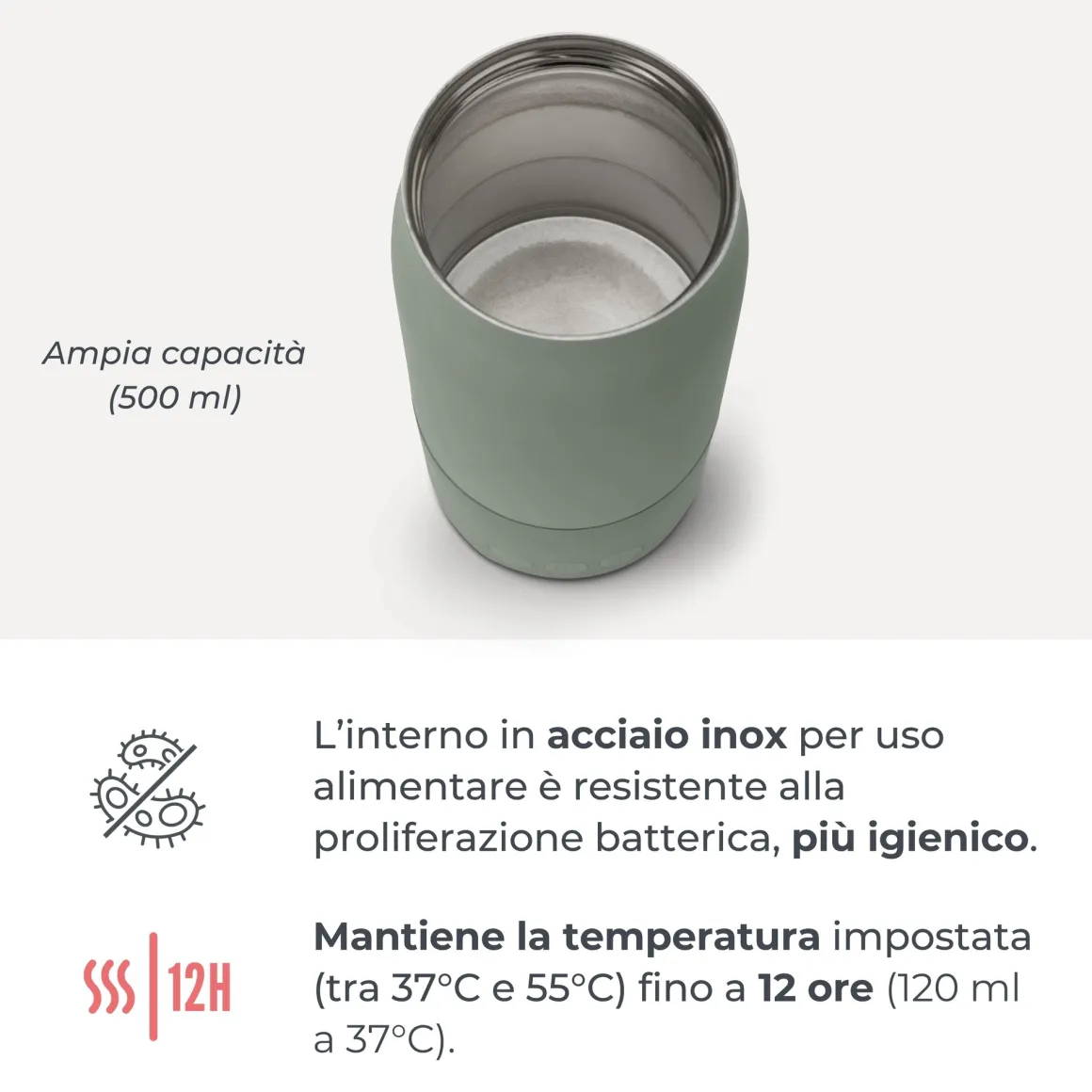 L’ampia apertura consente di inserire direttamente all’interno qualsiasi biberon (Ø max 7 cm), per un riscaldamento a bagnomaria omogeneo e sicuro, senza adattatori.