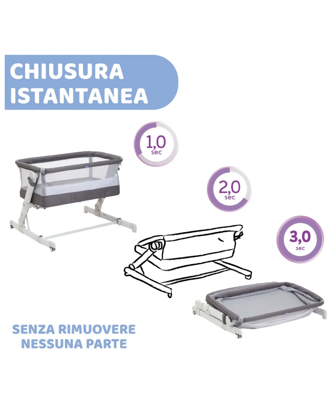 Next2Me Pop-Up è la culla fianco letto dotata diun sistema di chiusura innovativo, che le permette di essere montata e richiusa in soli 3 secondi. Una volta chiusa, Next2Me Pop-Up risulta super compatta e, grazie alla borsa da viaggio, può essere portata sempre con sé. Il compagno perfetto per la nanna, ovunque tu sia.